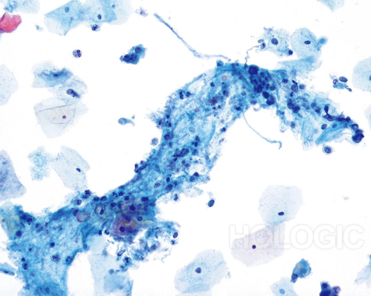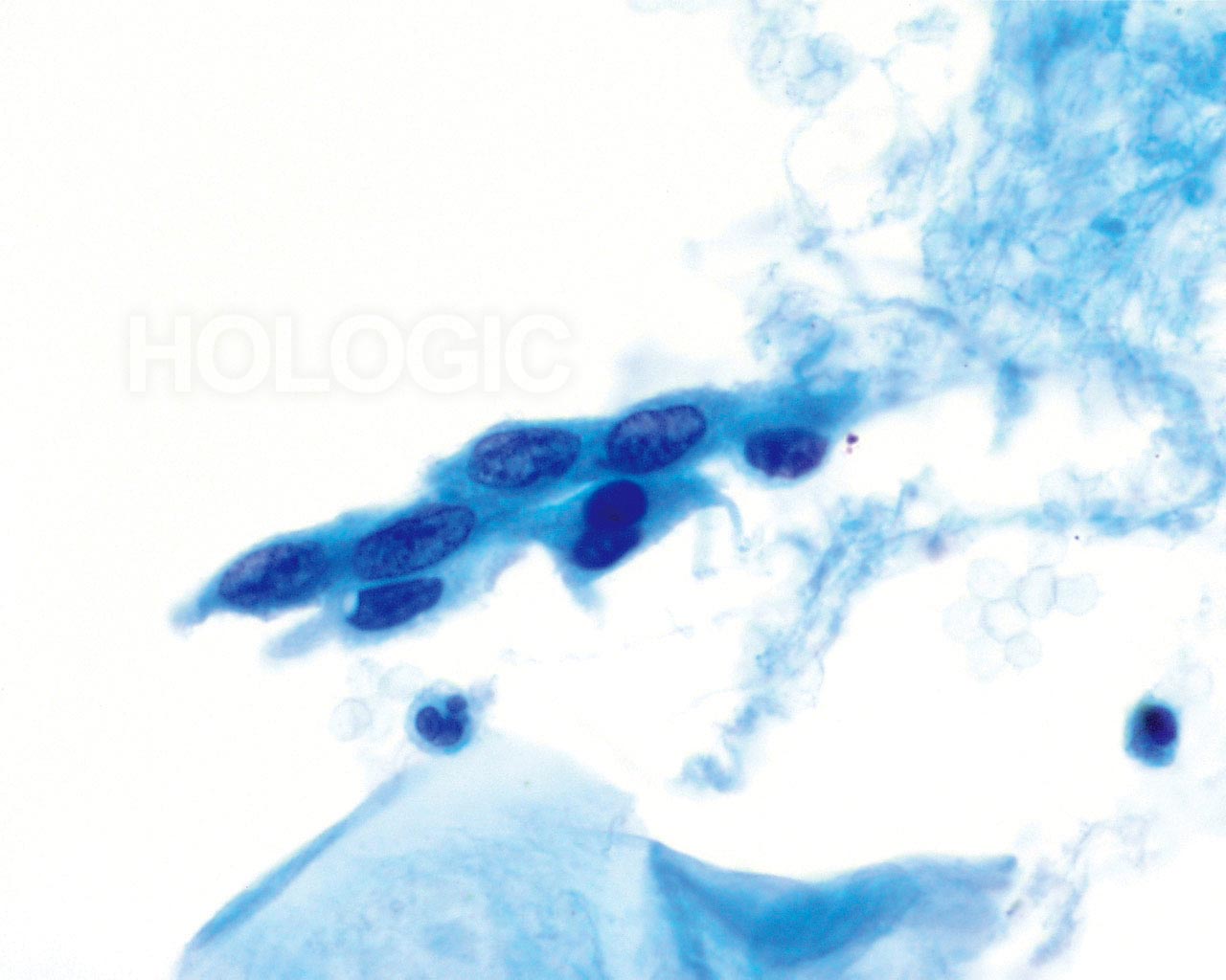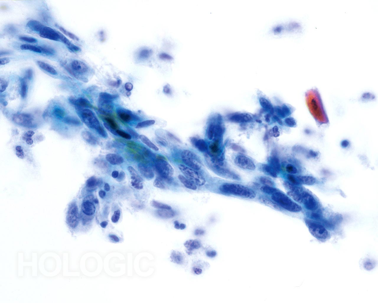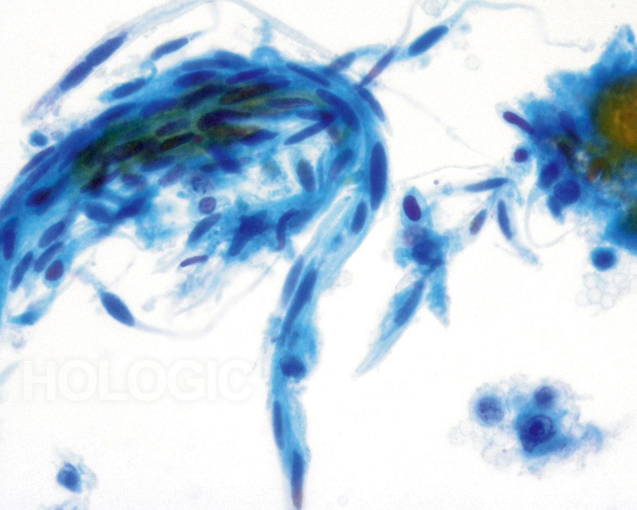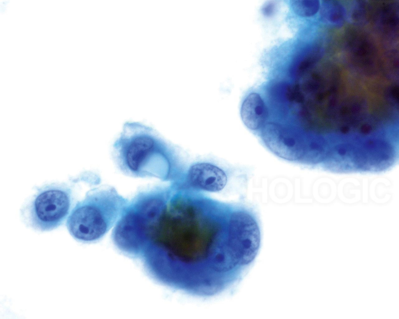 Das kleinzellige (Plattenepithel-) Karzinom kann ebenfalls mit Hilfe des ThinPrep Pap Tests diagnostiziert werden. Diese Läsionen bestehen aus kleinen, wenig differenzierten Epithelzellen, die auf den ersten Blick relativ gleichförmig erscheinen mögen. Ein wichtiges Merkmal, welches die Atypie dieser Zellen unterstreicht, ist die hohe Kern-Plasma-Relation. Sie haben ein spärliches, zerbrechlich erscheinendes Zytoplasma und können sogar als einzelne und in Gruppen gelagerte Nacktkerne vorkommen. Die synzytialen Verbände können Zellgruppen drüsigen Ursprungs imitieren aber ihnen fehlt die Abrundung und die Dreidimensionalität, die typisch für das Adenokarzinom sind.