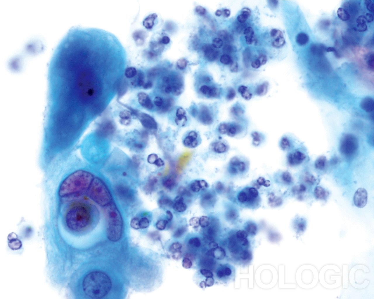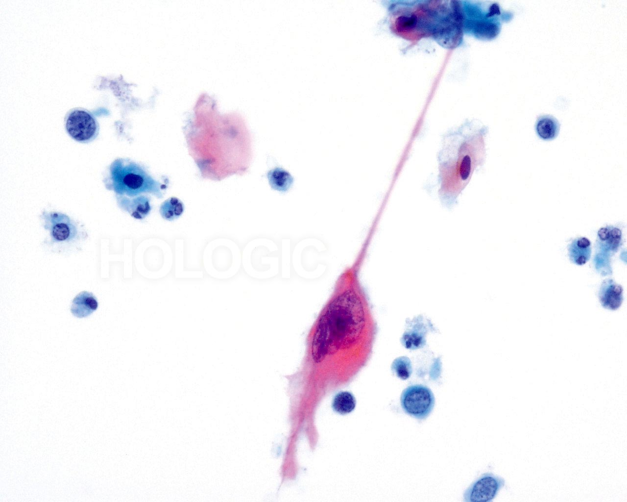 Plattenepithelzellen mit bizarren Formen – spindelförmig, kaulquappenförmig etc. ergeben im ThinPrep® Pap Test ein charakteristisches Bild. Die Veränderungen können verlässlich als echte Pleomorphismen von Ausstrichartefakten unterschieden werden. Die extreme Zell- zu Zellvariabilität von Größe und noch wichtiger, von Form, unterscheidet verhornende Plattenepithelkarzinome von verhornenden Dysplasien. Eine ähnliche Vielfalt an Größe und Form besitzen auch die Zellkerne. Sie weisen eine ausgeprägte Hyperchromasie auf, sogenannte „Tintenkleckse“, und können gelegentlich, aufgrund der übermäßigen Verhornung, als so genannte„Geisterzellen“ erscheinen. Ebenfalls durch die starke Keratinisierung bedingt, können sich verhornte Ausläufer des Zytoplasmas aus dem Zellkörper ausstülpen. Diese Eigenschaft trägt zum pleomorphen Erscheinungsbild bei und hilft, Plattenepithelkarzinome von atypischen Parakeratosen und verhornenden LSIL zu unterscheiden.