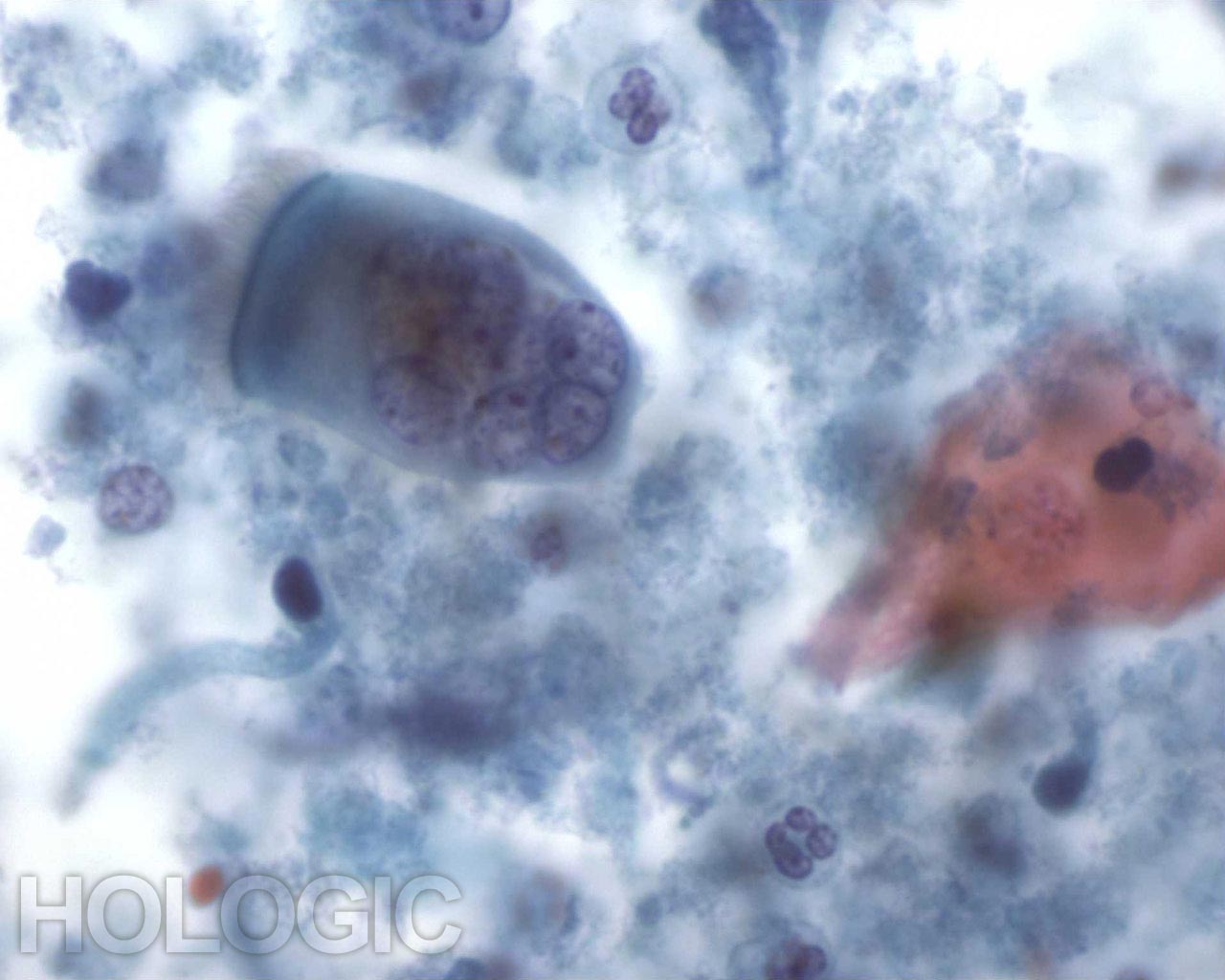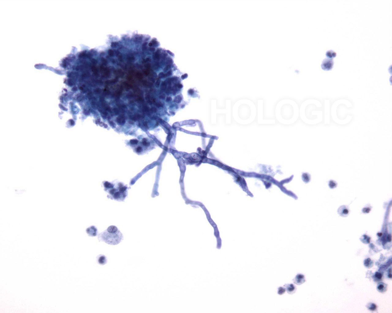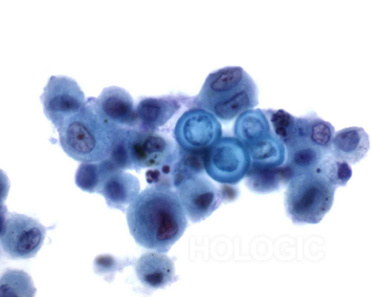 Las esporas de hongo se pueden ver entremecladas con las células escamosas. Representan muy probablemente contaminación