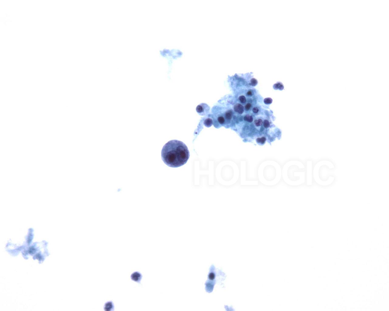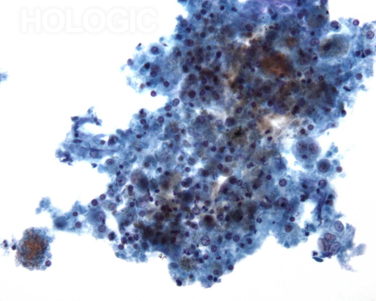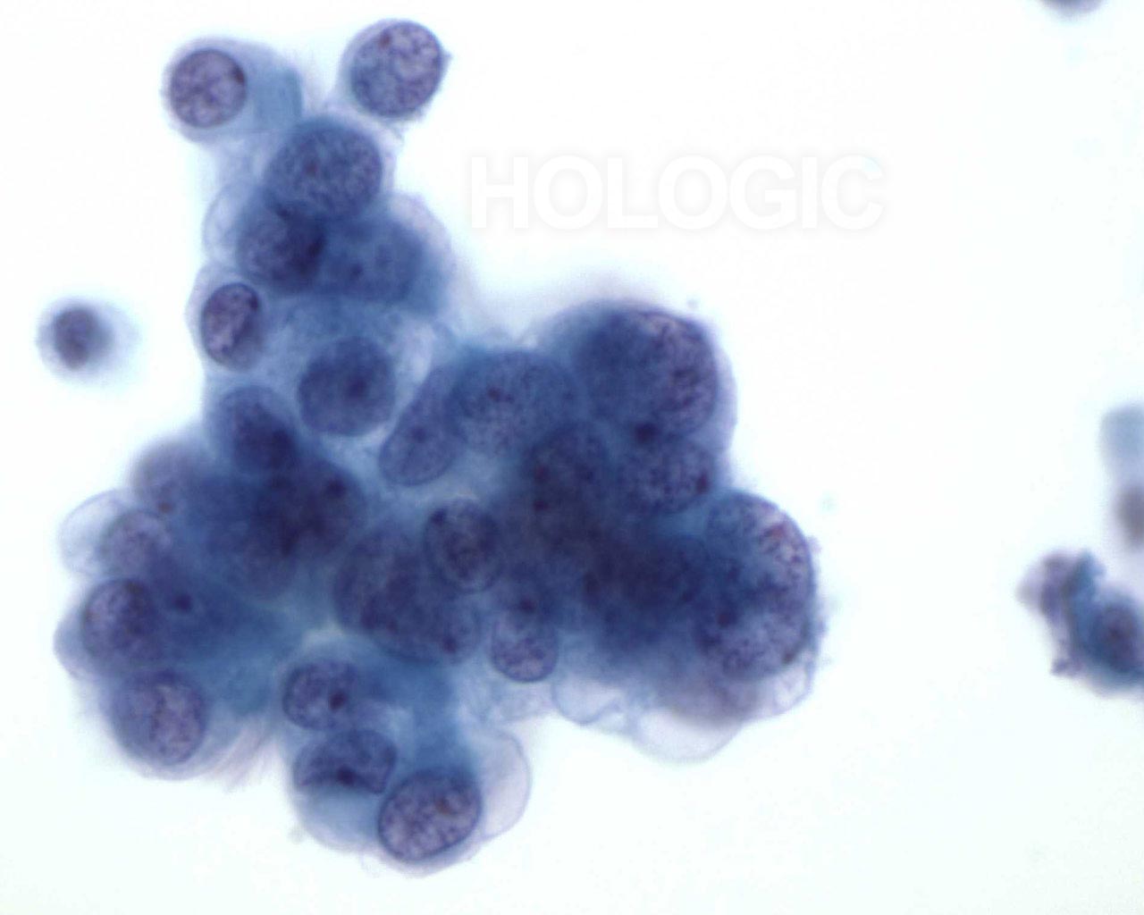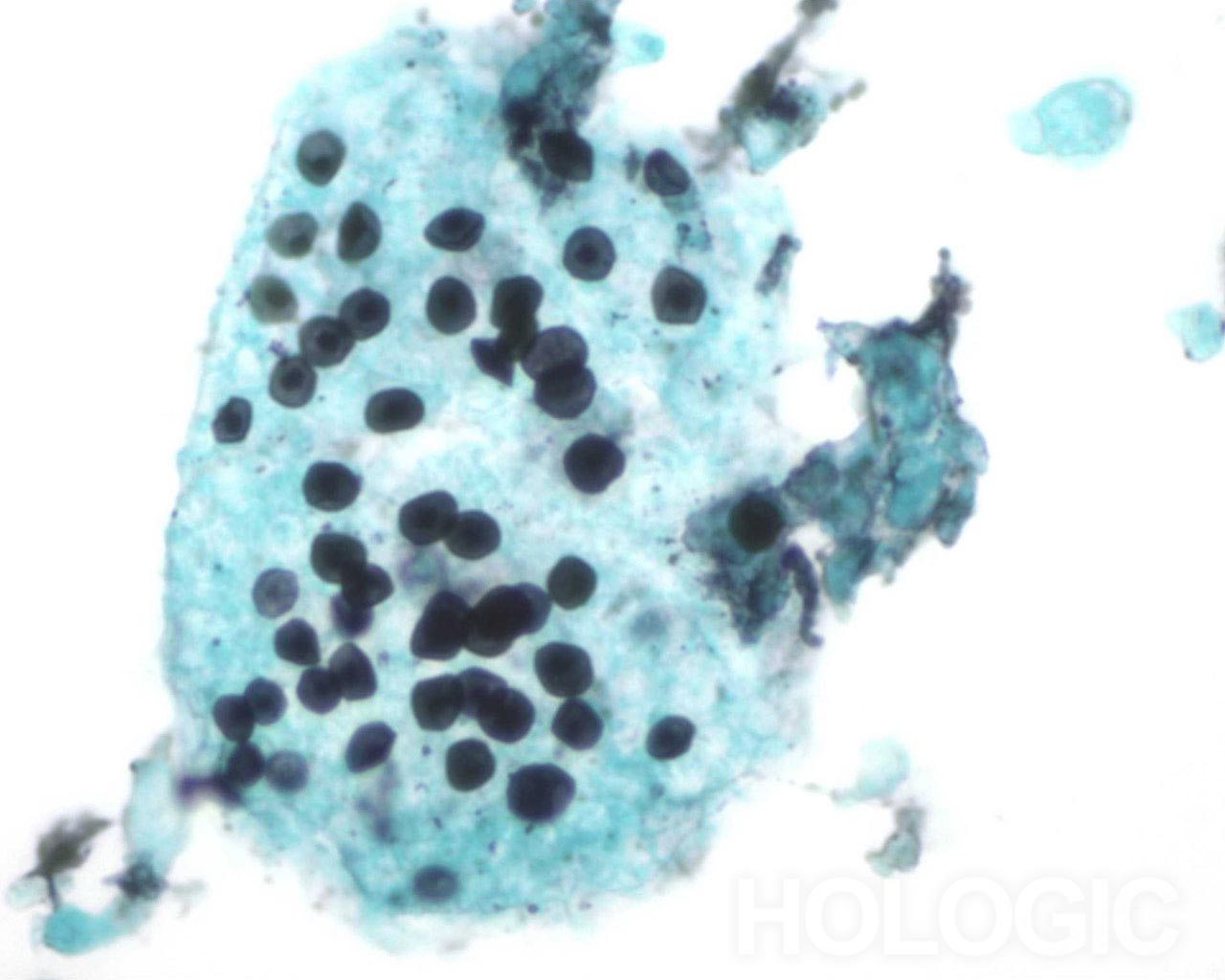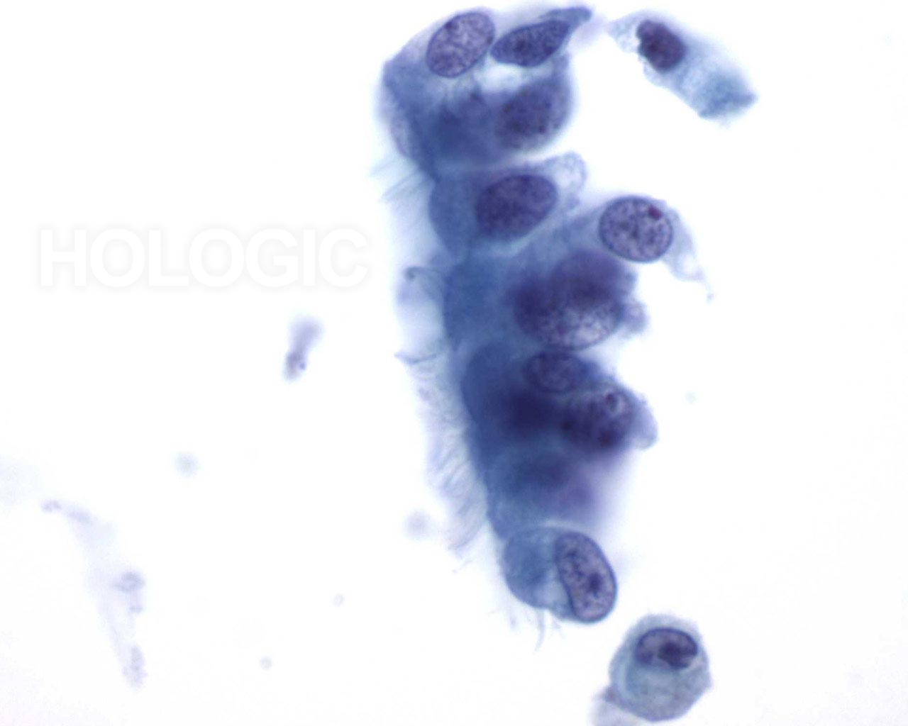 En esta muestra de lavado broncoalveolar se ilustra un grupo benigno de células epiteliales.0x