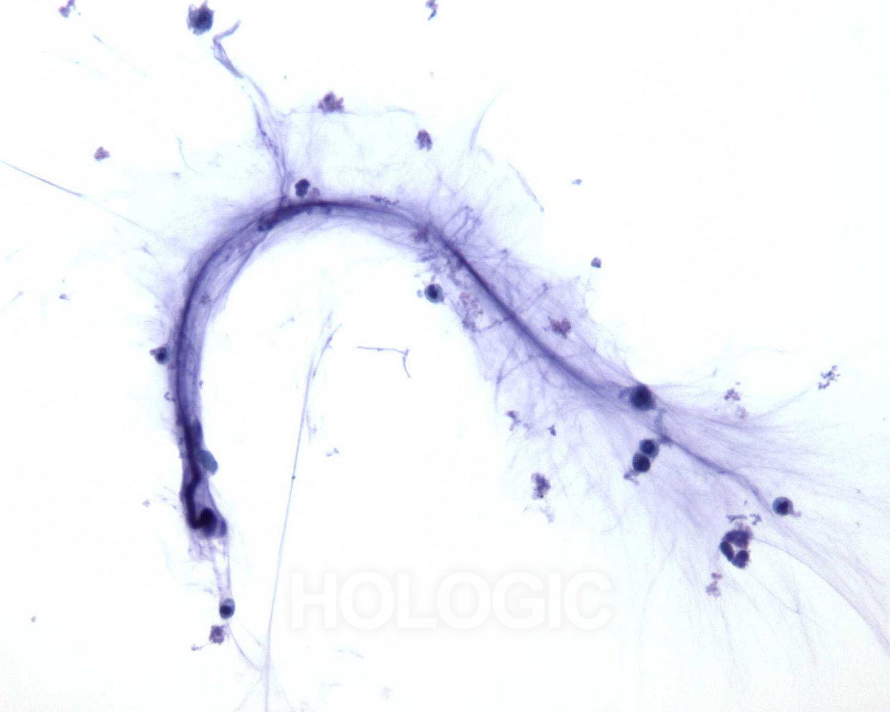 Incluso con la tinción de Papanicolaou, los Zygomycetos tienen unas hifas pigmentadas de color parduzco. 20x