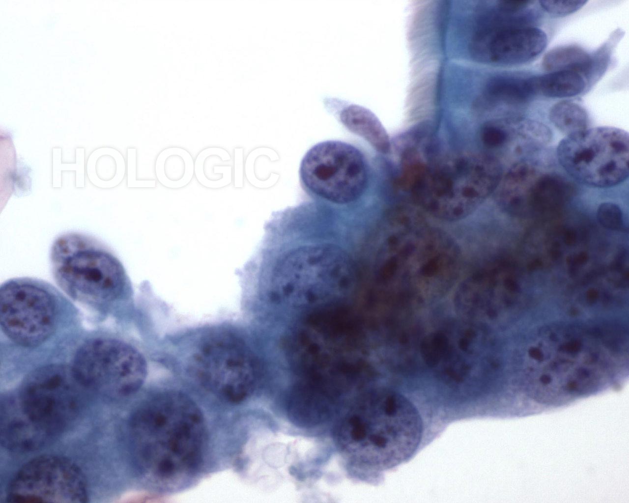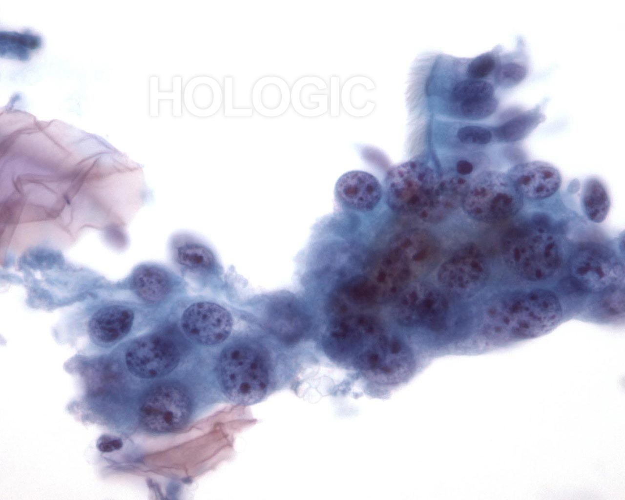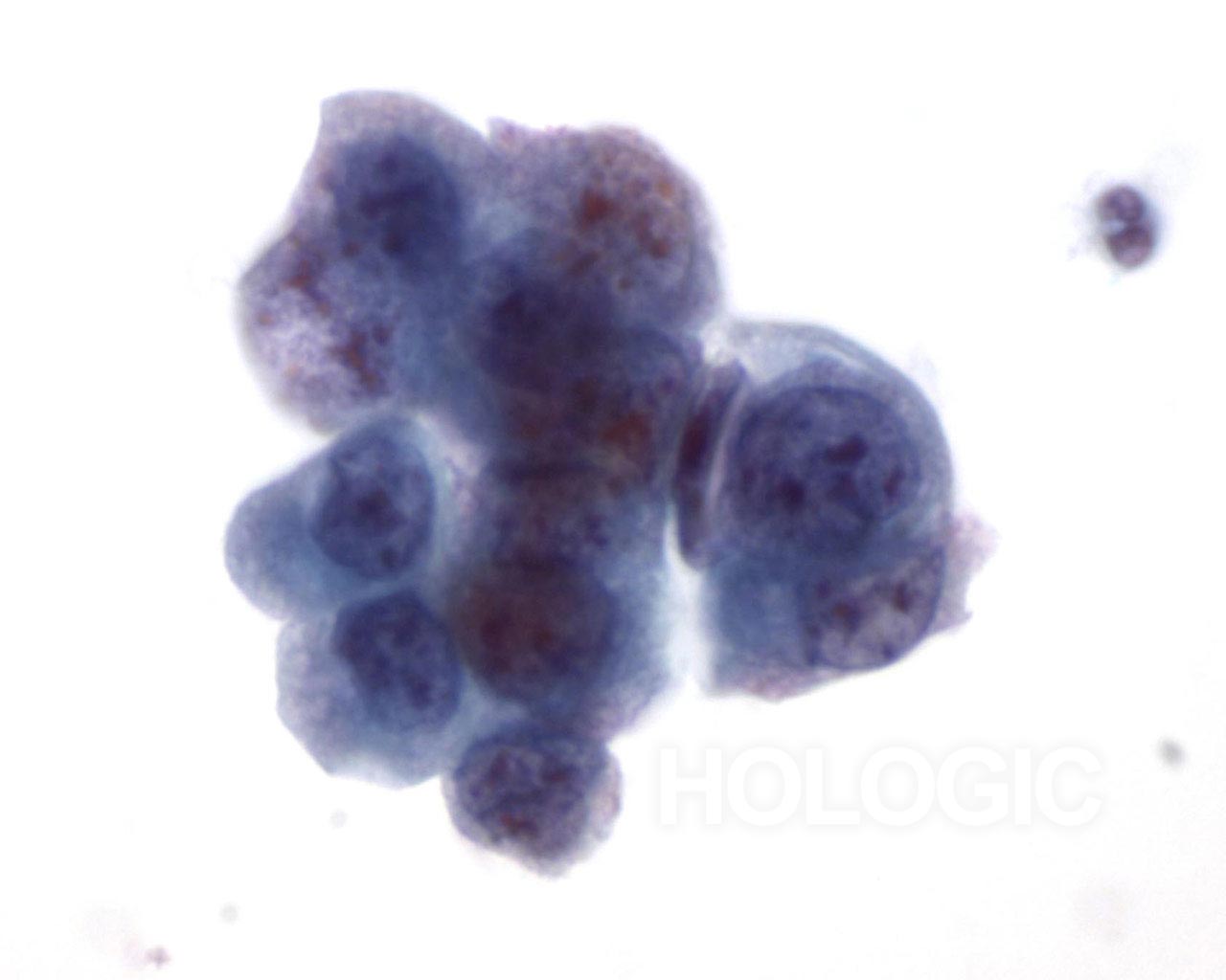 Faible grossissement montrant un groupe de cellules issu d’un carcinome indifférencié à grandes cellules.