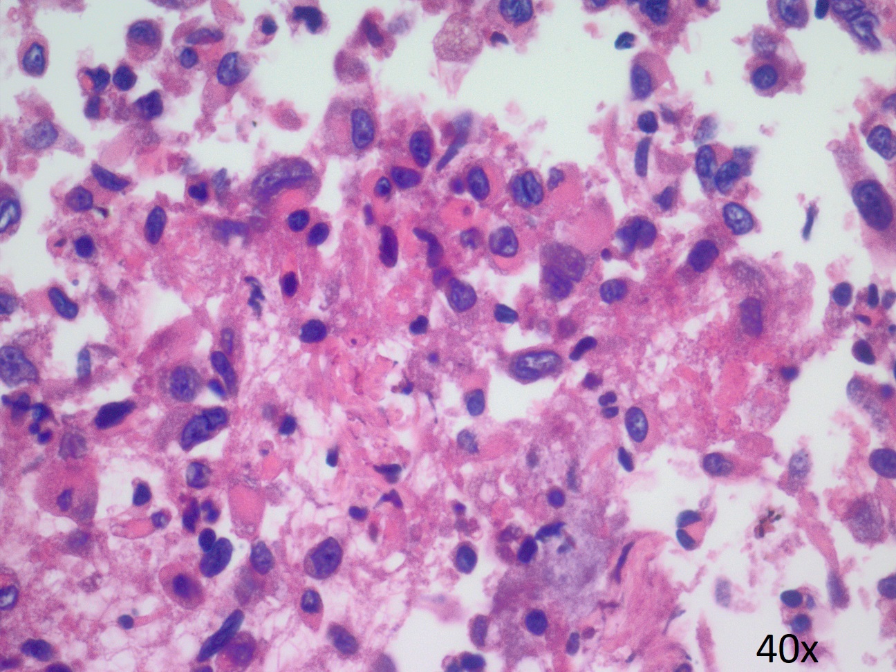 Granuloma: Granulomas contain epithelioid histiocytes. These appear as syncytial aggregates without distinct cell borders. In necrotizing granuloma, there will be necrosis that is in the background or clinging to the histiocytes. The nuclei are elongated with pale, evenly distributed chromatin. The cytoplasm is dense and granular or vacuolated. Due to the elongated nature of the nuclei they can be confused with sarcomas or spindle cell neoplasms. Histiocytes are negative for cytokeratin and positive for CD68 and CD163.1, 3, 5