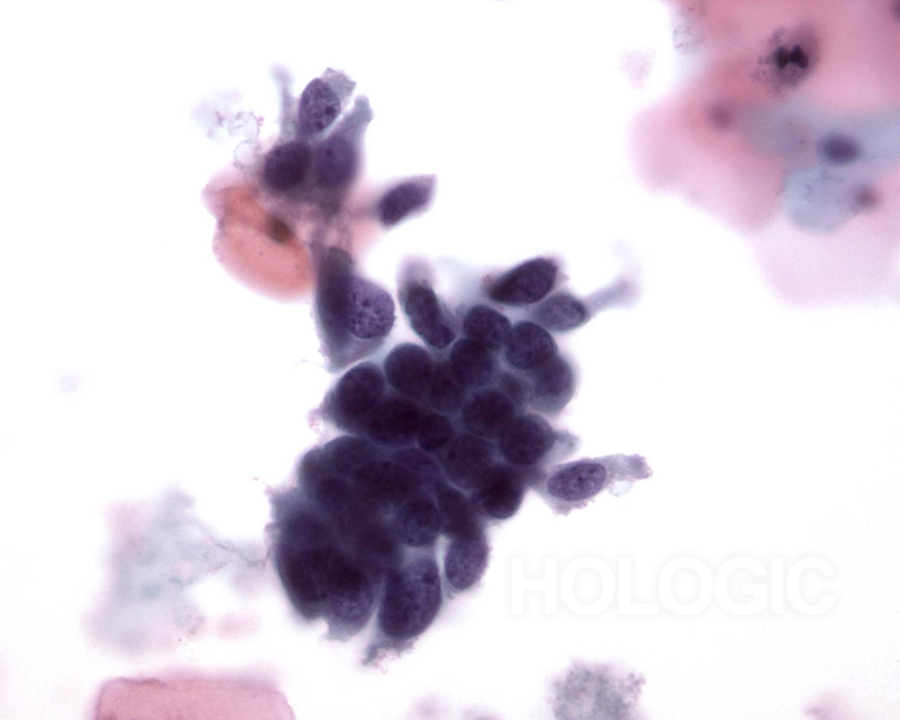Variably sized, crowded, hyperchromatic groups of cells are seen on screening power which warrant a closer inspection. 20x