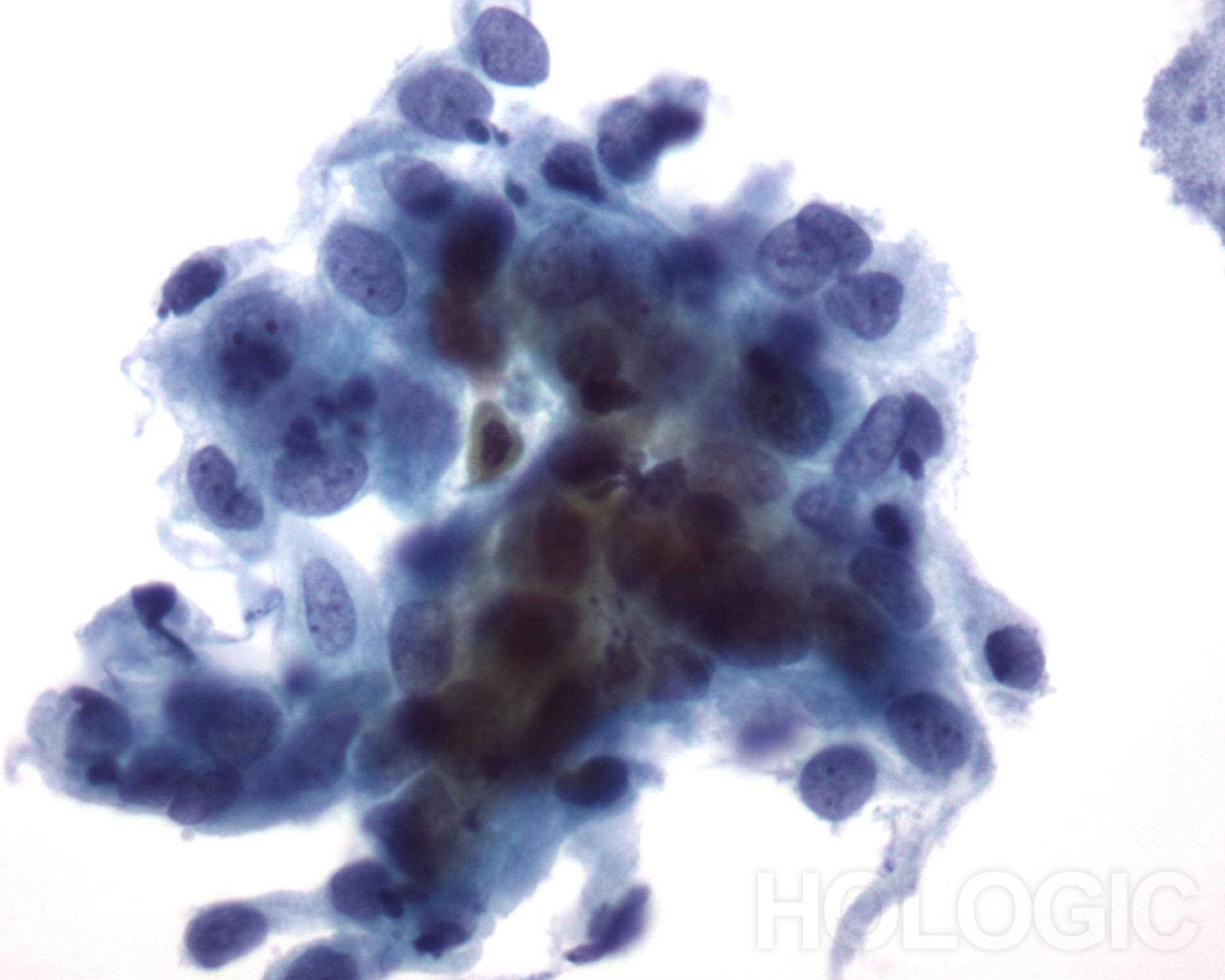 Nucleoli can be indistinct to prominent. In this image, the nucleoli are prominent and present in a majority of the nuclei. Rapid fixation makes the presence of nucleoli another important piece of criteria in the diagnosis of AIS.