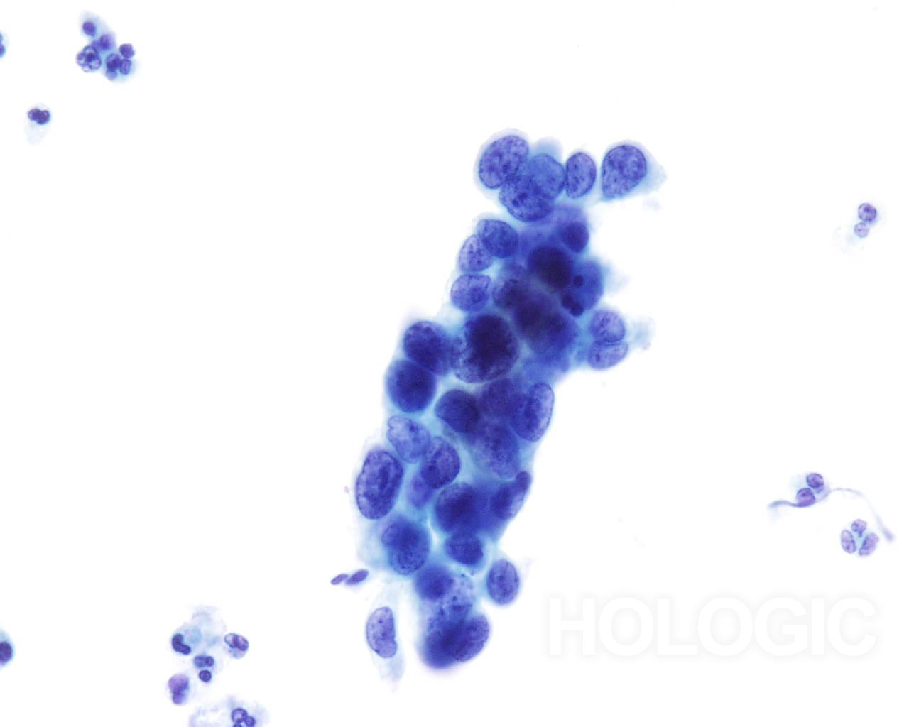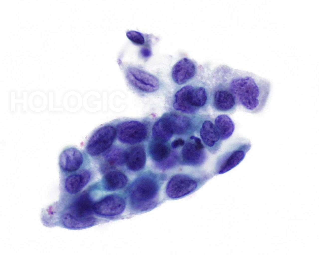 - Ill-defined cytoplasm at group edges (frayed appearance)