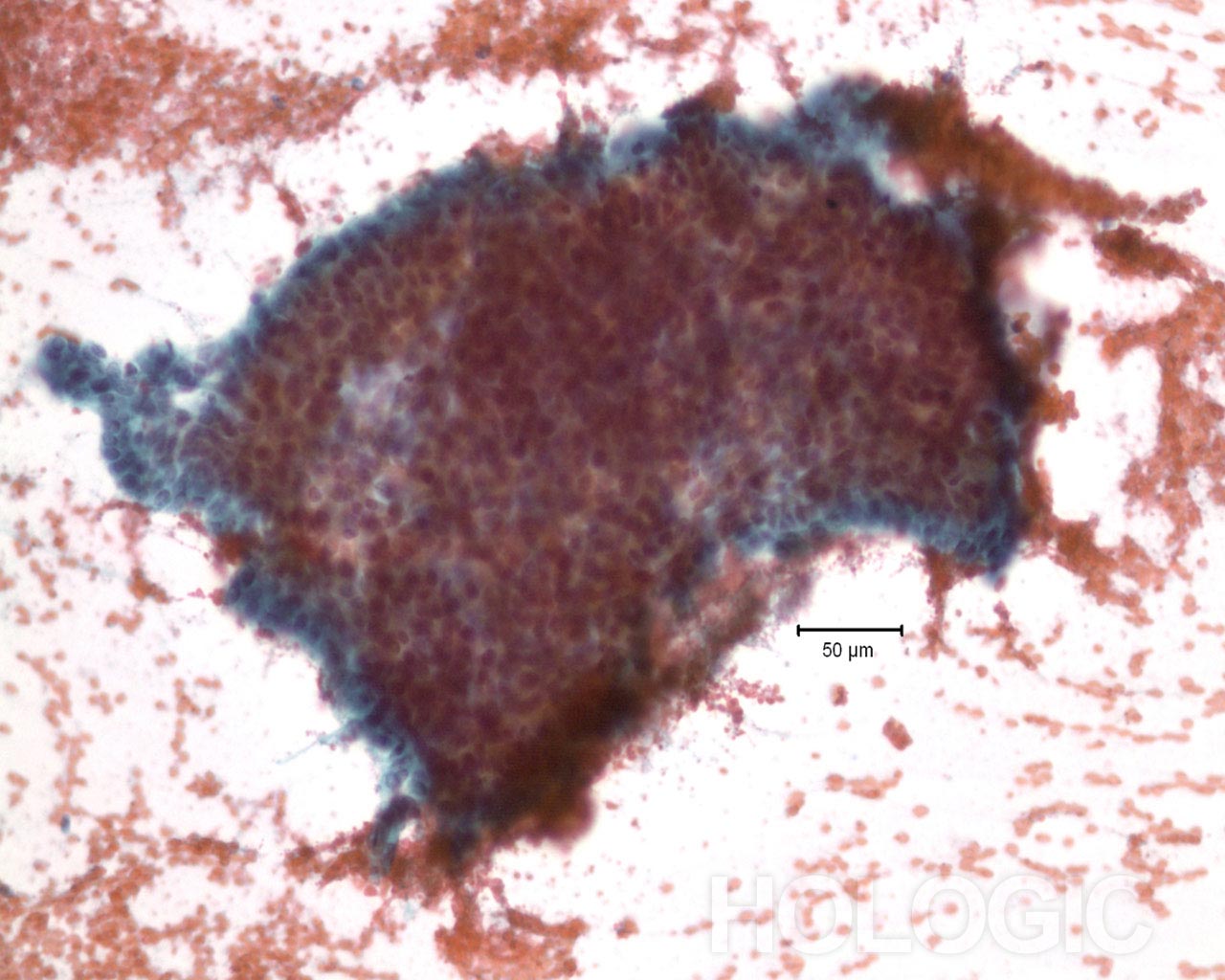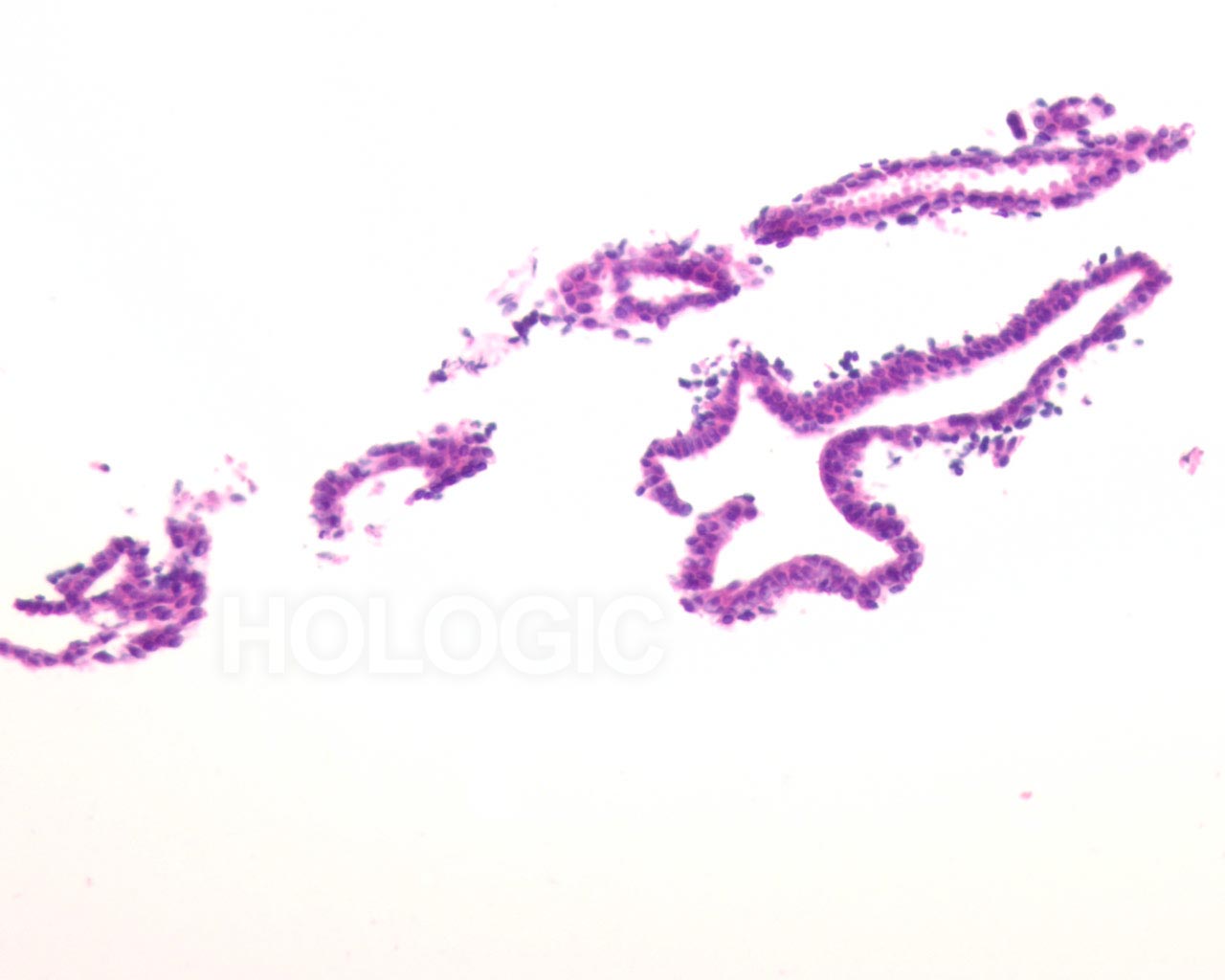 Wat er met ThinPrep® uitzag als een platte laag, ziet er nu uit als een lijn van cellen. U kunt gemakkelijk bij een kleine vergroting zien dat de benigne ductale cellen slechts een dikte van één cel hebben. Let op de licht klevende myoepitheliale cellen aan de buitenkant van de melkgang.