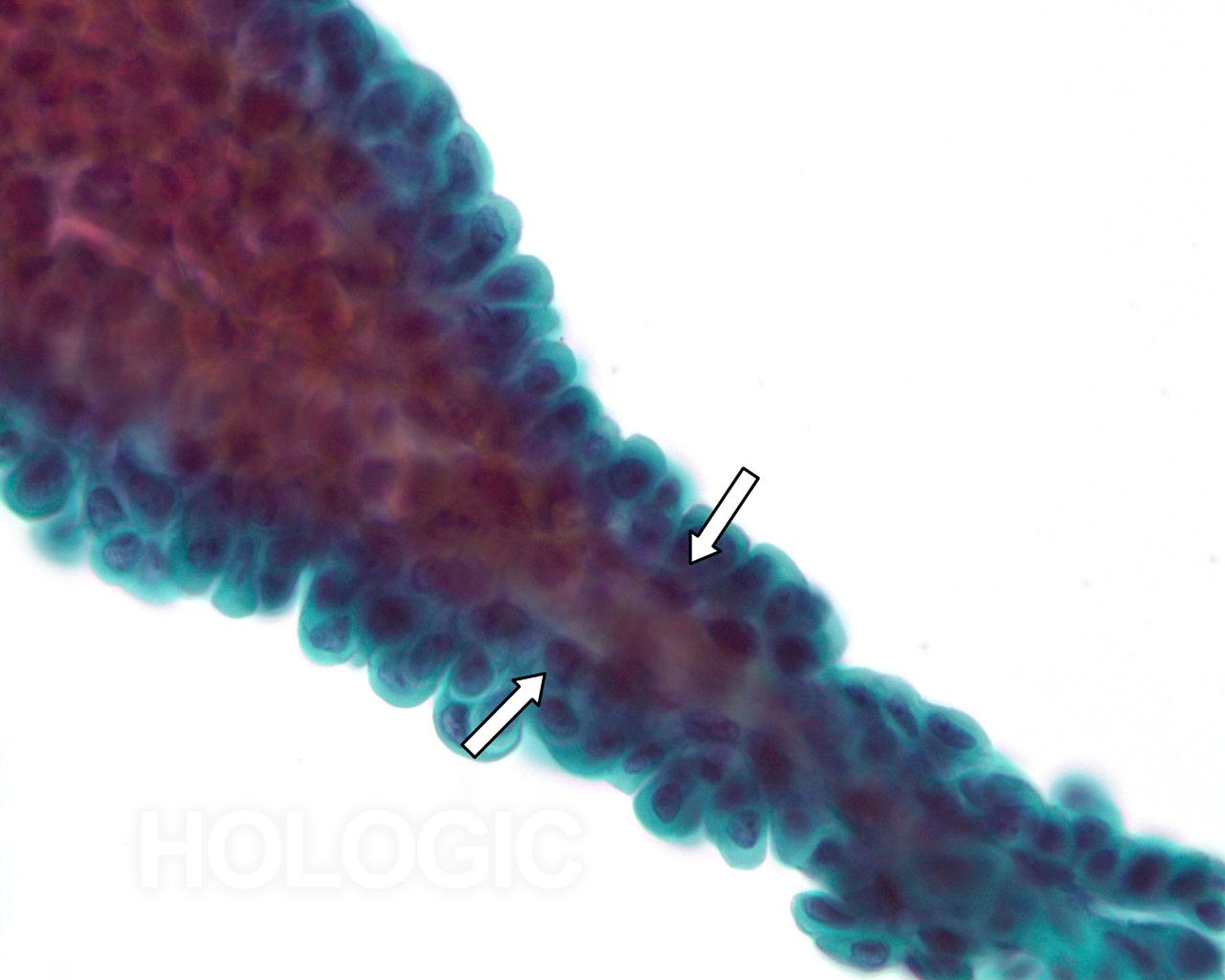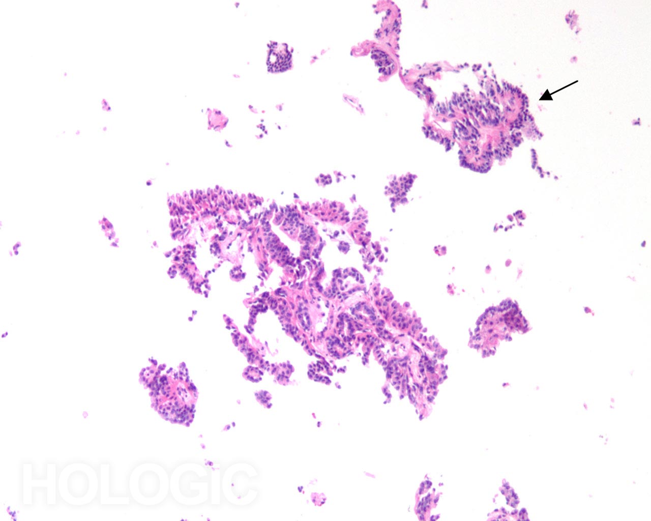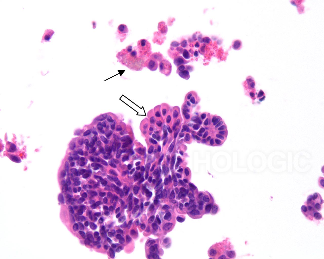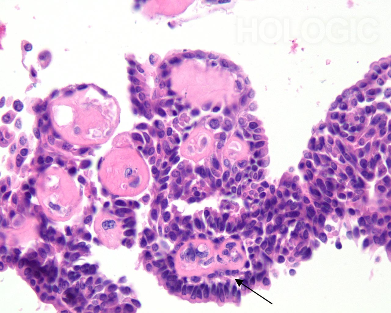 Door histologische coupes te maken, kunnen de samenstelling, architectuur en cytologische kenmerken van de grotere papillaire fragmenten bestudeerd worden. Myoepitheliale cellen zijn duidelijk aanwezig (pijlen) en en wordt geen stratificatie van de ductale cellen waargenomen.