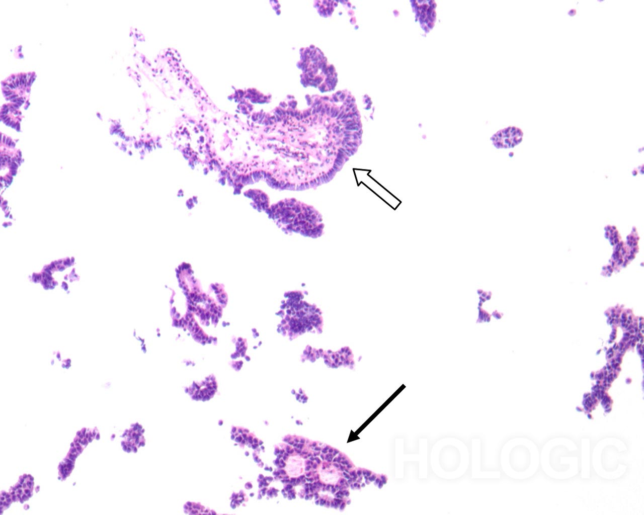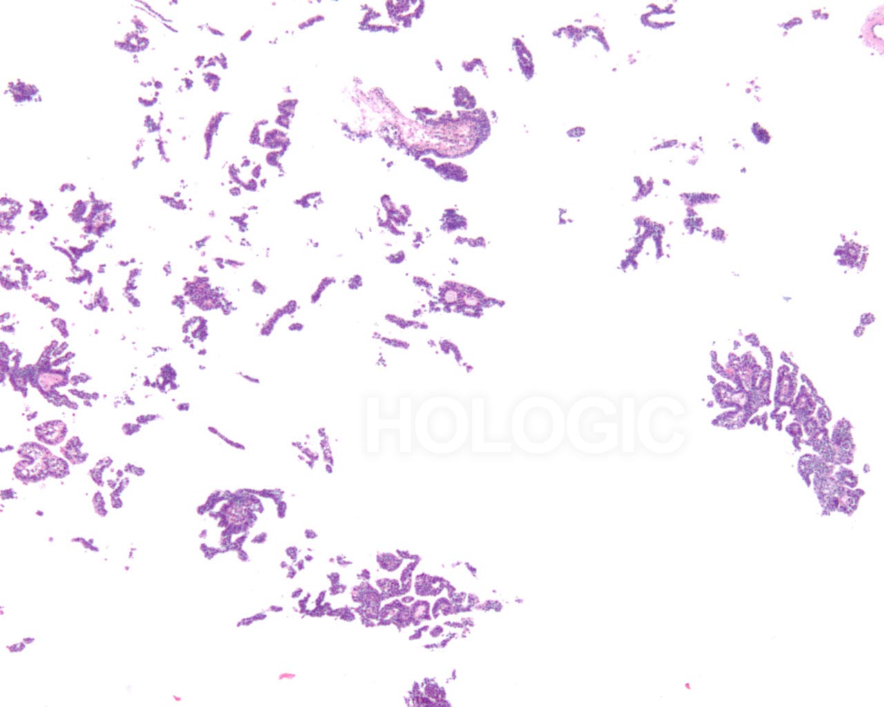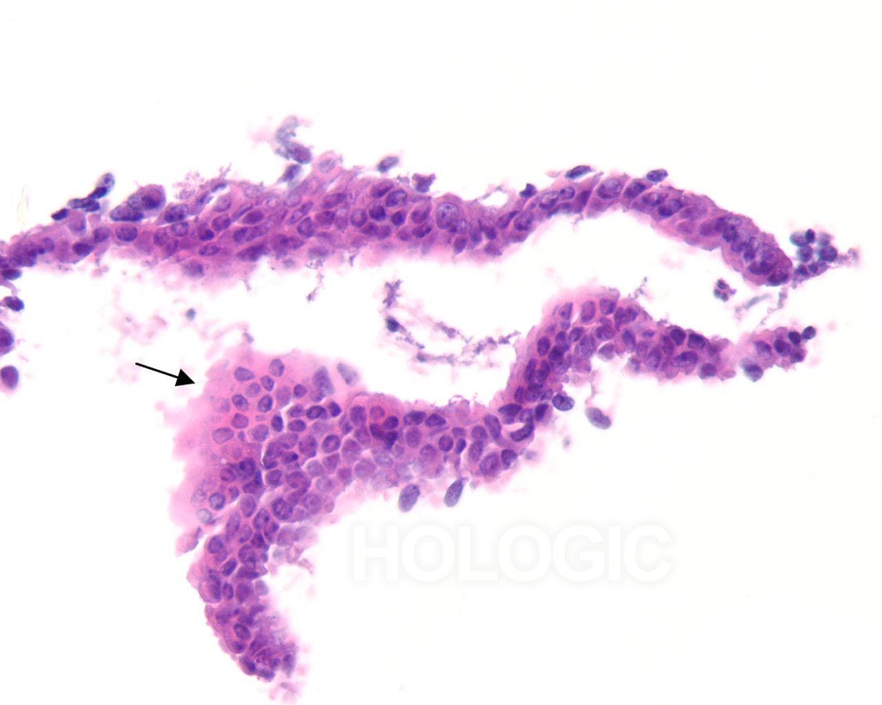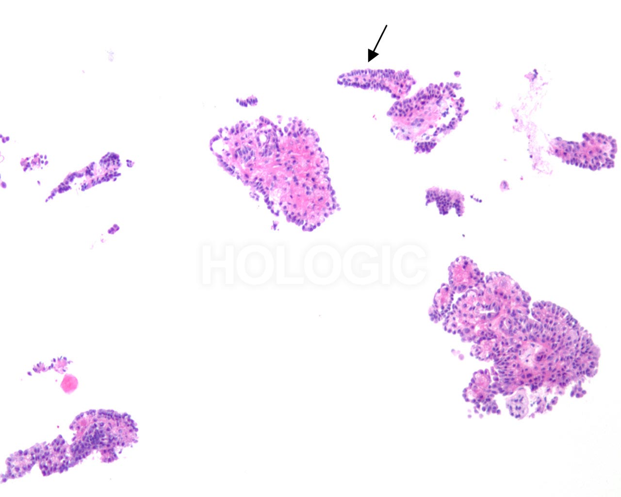 Door histologische coupes te maken, kunnen de samenstelling, architectuur en cytologische kenmerken van de grotere papillaire fragmenten bestudeerd worden. Myoepitheliale cellen zijn duidelijk aanwezig (pijlen) en en wordt geen stratificatie van de ductale cellen waargenomen.