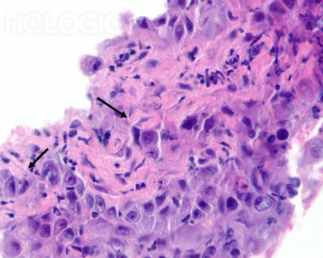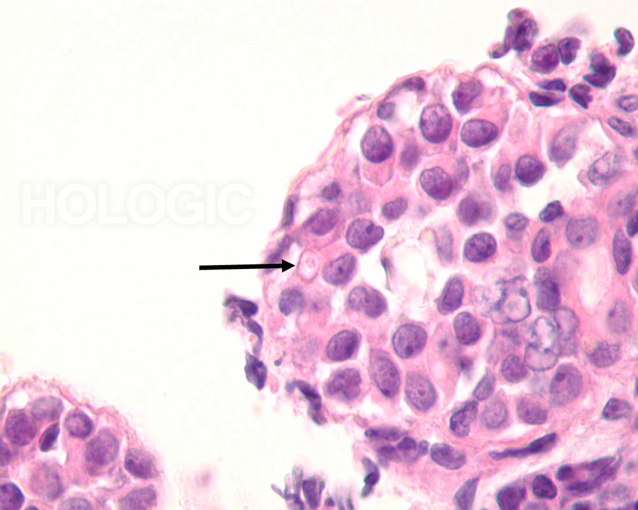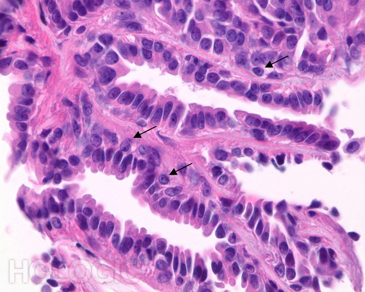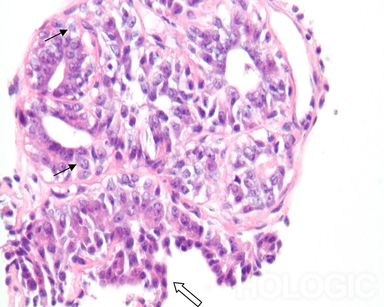 Door histologische coupes te maken, kunnen de samenstelling, architectuur en cytologische kenmerken van de grotere papillaire fragmenten bestudeerd worden. Myoepitheliale cellen zijn duidelijk aanwezig (pijlen) en en wordt geen stratificatie van de ductale cellen waargenomen.