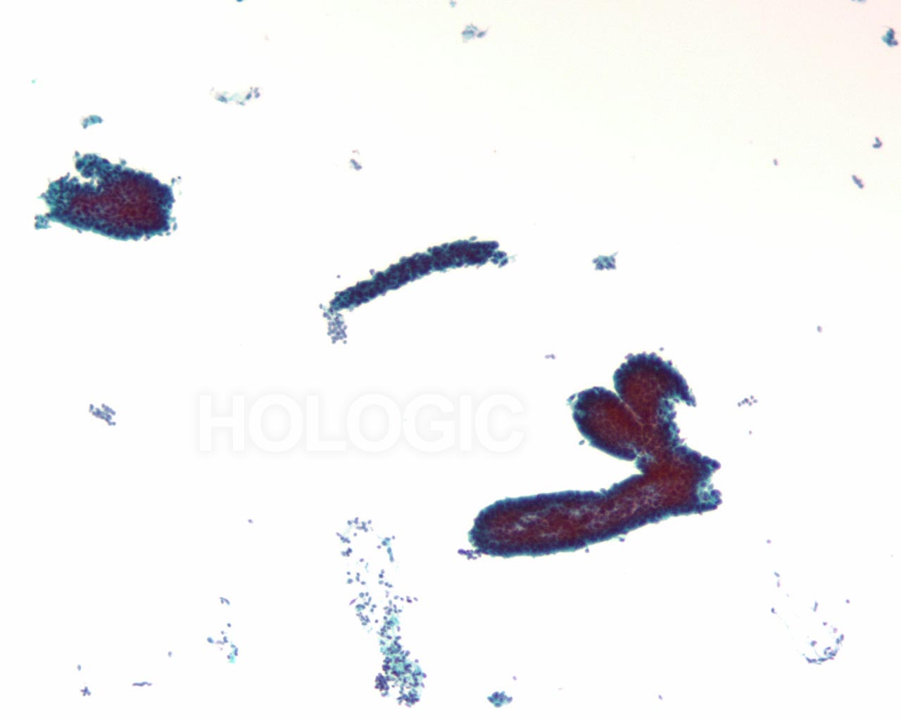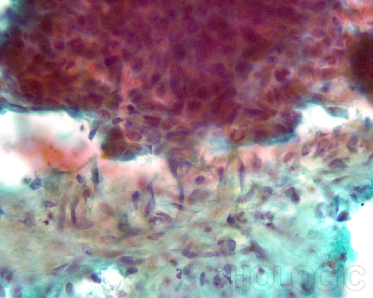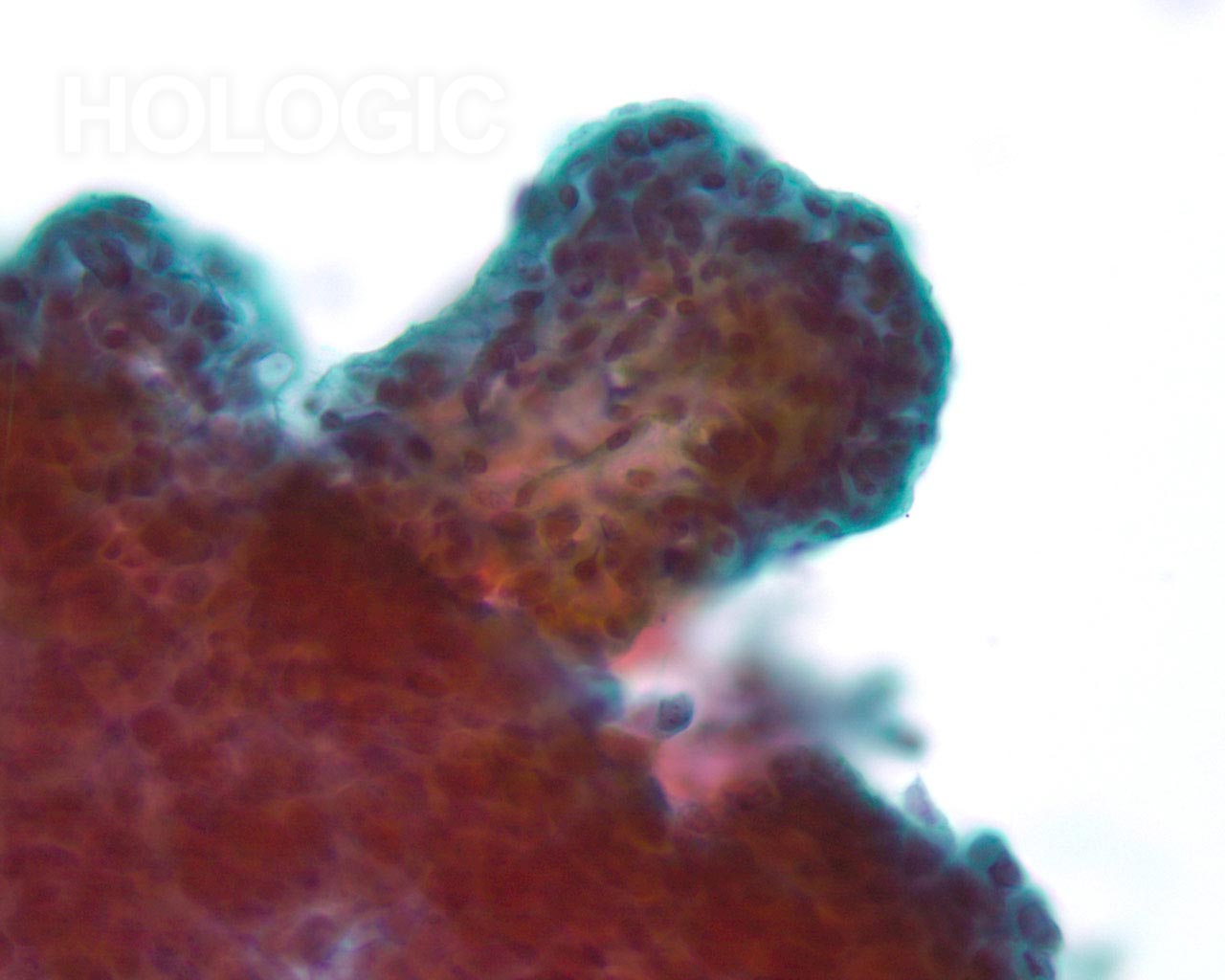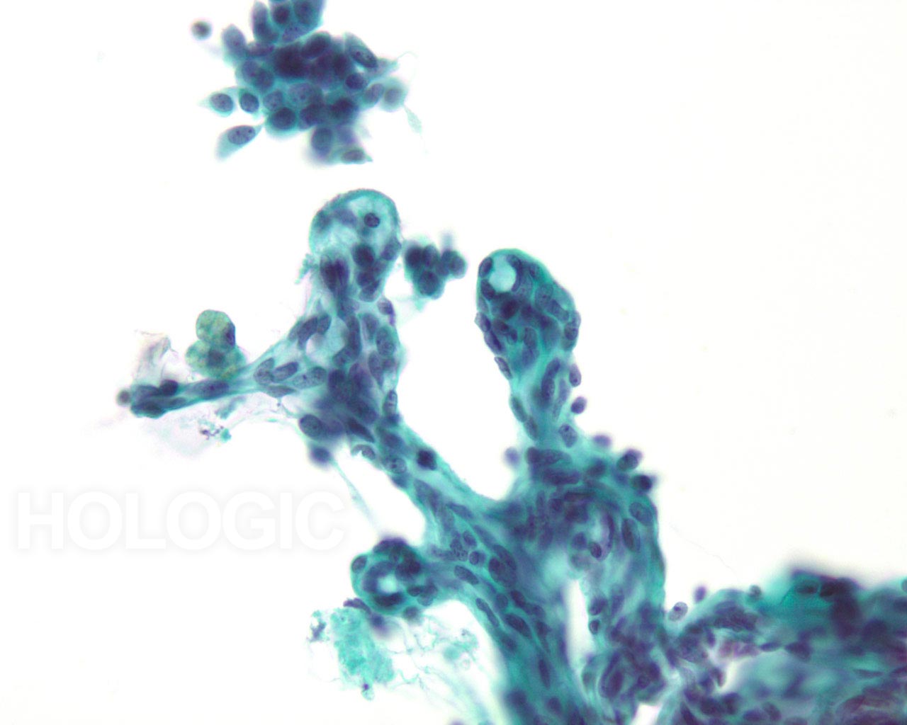 Wanneer fibrovasculaire kernen van ductale cellen worden ontdaan, is de papillaire aard van de laesie duidelijk zichtbaar. Let op het gladde oppervlak van de stromale kernen; dit duidt erop dat het stromale collageen is neergelegd in samenwerking met een overliggende populatie van epitheelcellen. Als de stromale oppervlakken ruw zijn, is het soms niet mogelijk om een papillair neoplasma met zekerheid in een cytologisch preparaat te diagnosticeren.