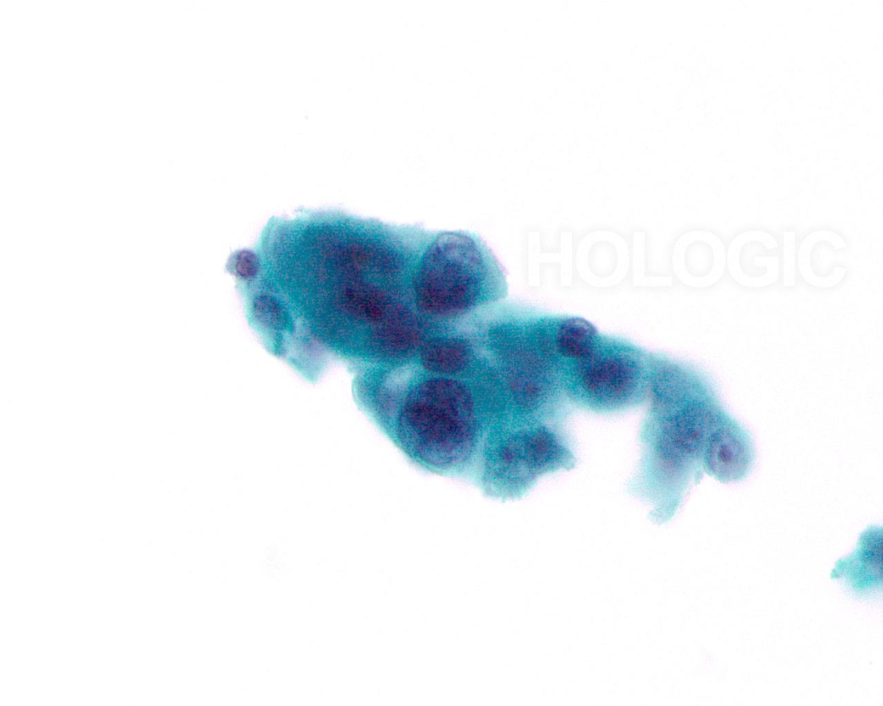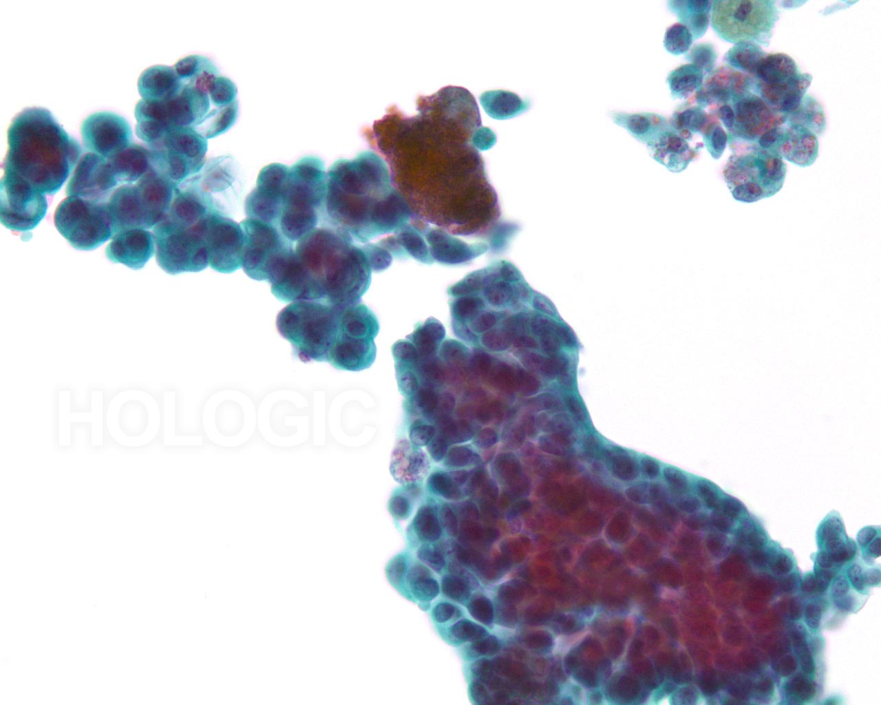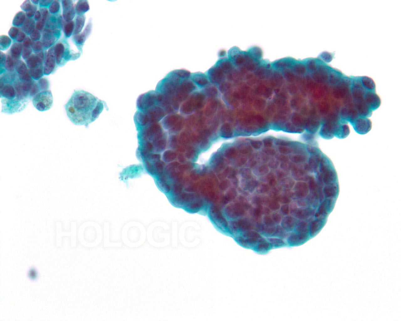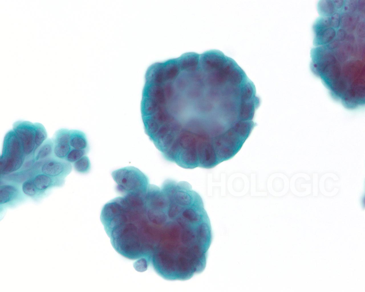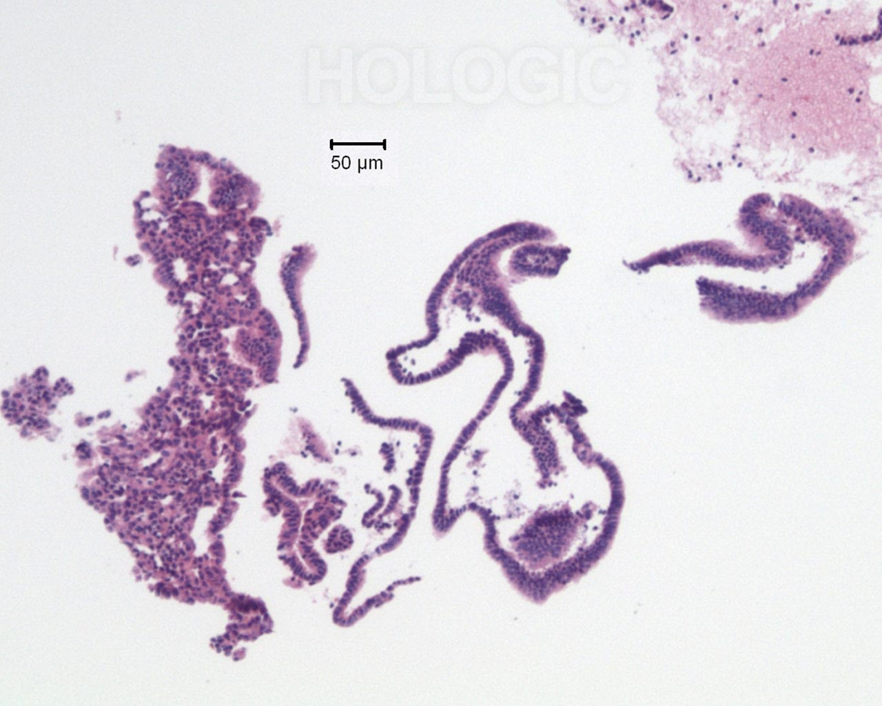 Wanneer fibrovasculaire kernen van ductale cellen worden ontdaan, is de papillaire aard van de laesie duidelijk zichtbaar. Let op het gladde oppervlak van de stromale kernen; dit duidt erop dat het stromale collageen is neergelegd in samenwerking met een overliggende populatie van epitheelcellen. Als de stromale oppervlakken ruw zijn, is het soms niet mogelijk om een papillair neoplasma met zekerheid in een cytologisch preparaat te diagnosticeren.