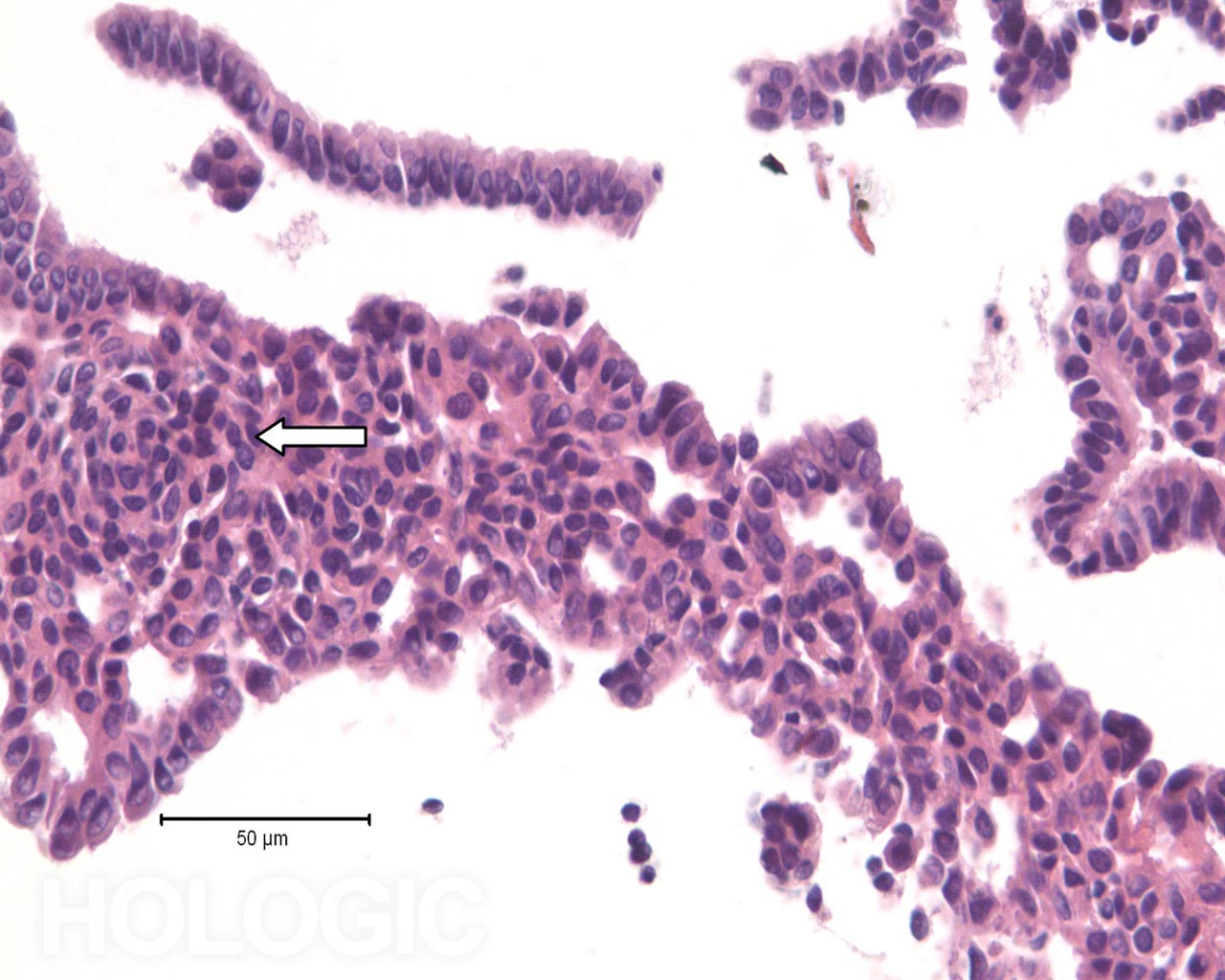 Benigne ductale cellen met milde cilindervormige veranderingen (boven) contrasteren met het gebied met typische ductale hyperplasie (onder). Let op de duidelijk afwijkende celtypen in het midden; sommige met grote, bleke kernen en anderen met kleine, donkere kernen.
