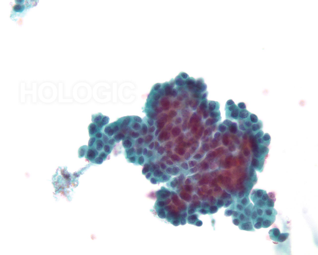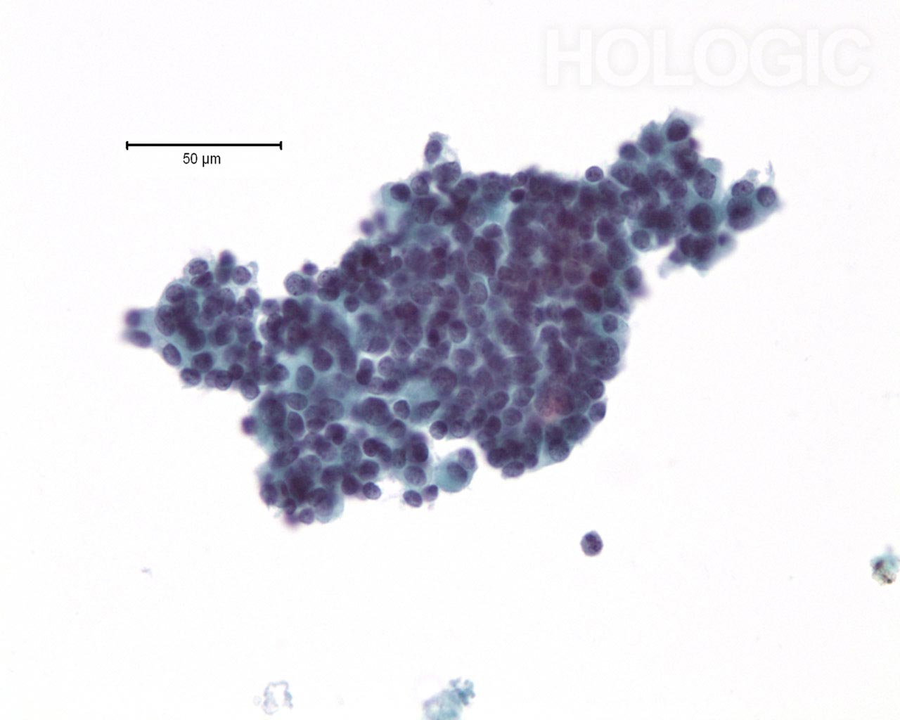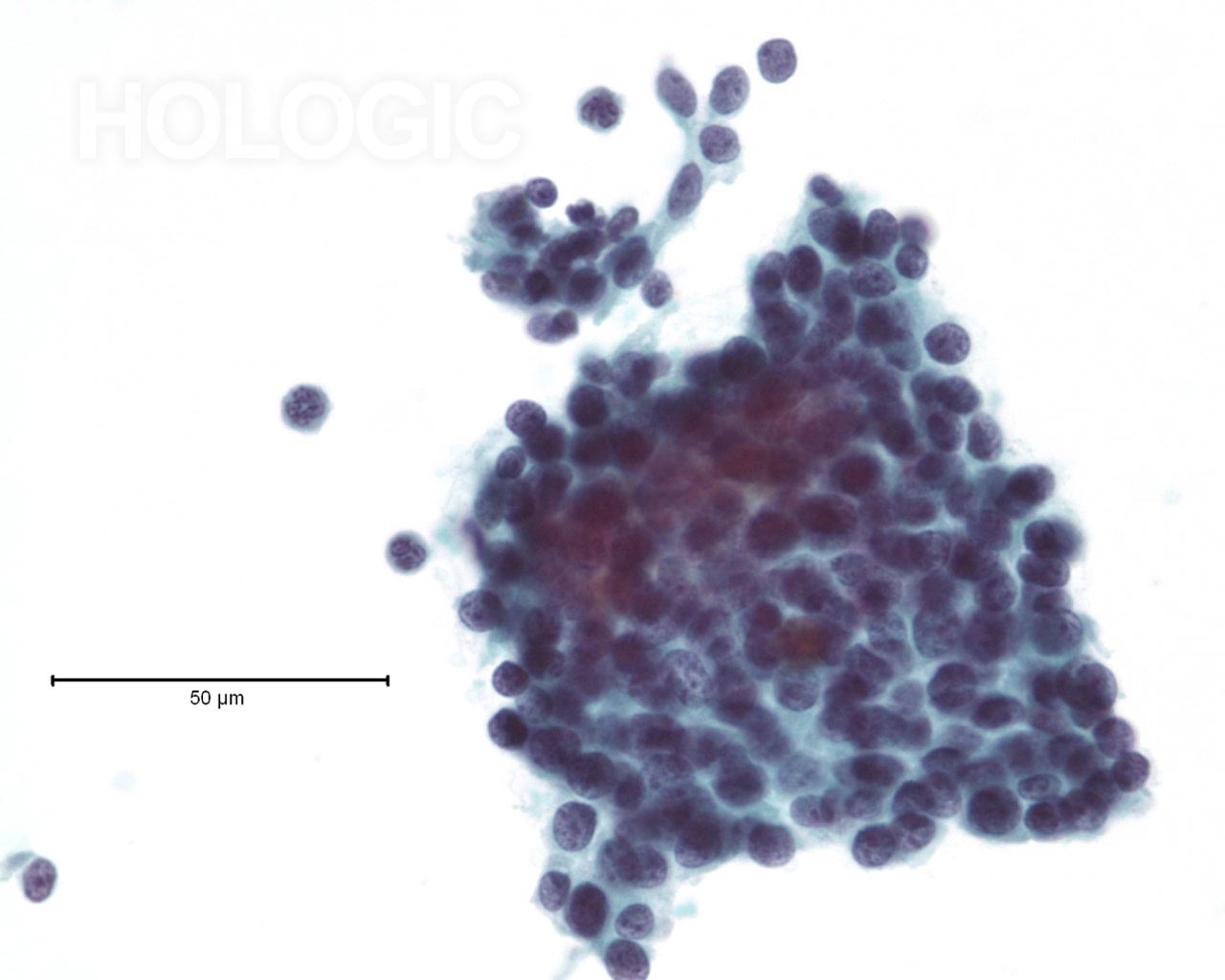 Een in-situ groeipatroon van lobulaire neoplasie is moeilijk of onmogelijk te identificeren in cytologische preparaten. Deze cluster van ongeveer 5 trossen is gedeeltelijk opgezet door het kenmerkende patroon van een losse ‘zak knikkers’ van lobulaire neoplasie zonder vorming van een glandulair lumen.