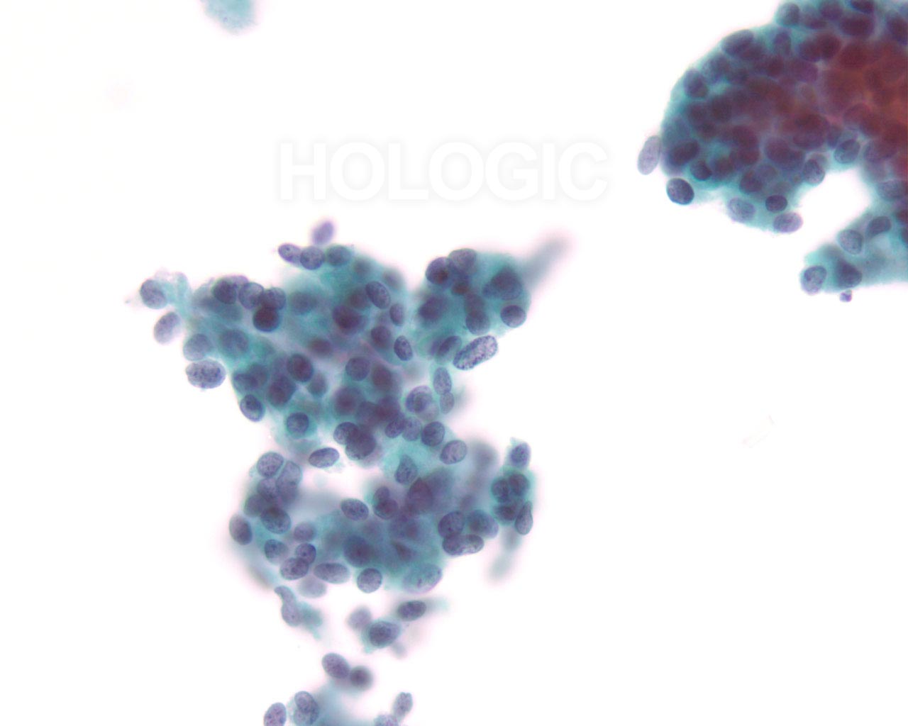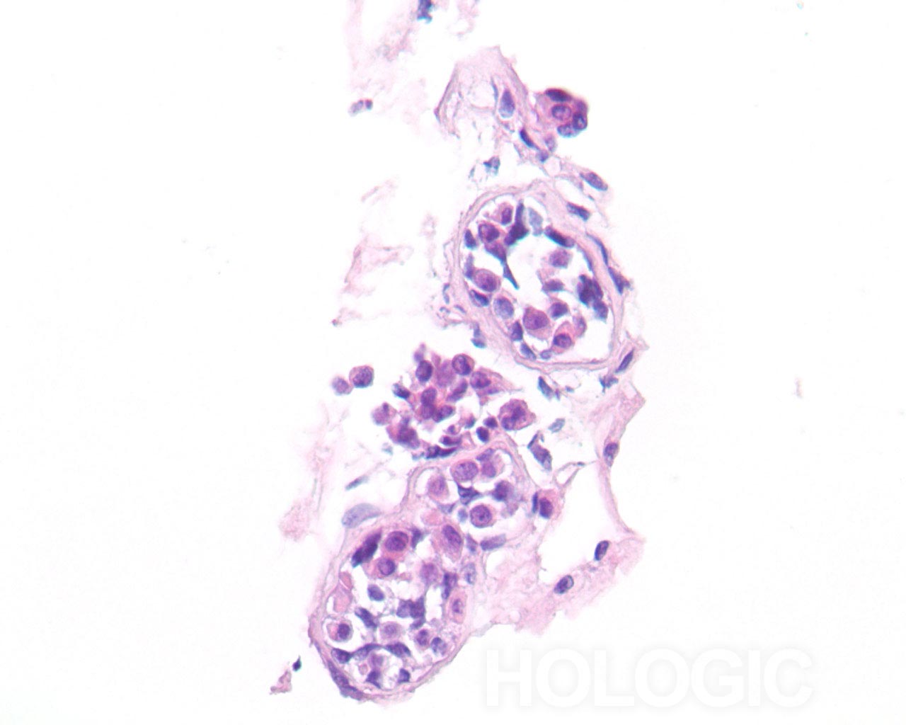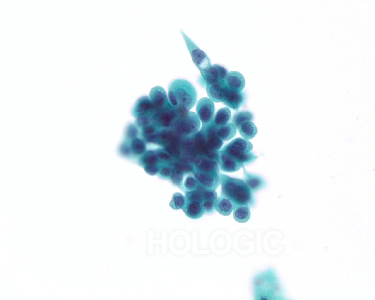 Een in-situ groeipatroon van lobulaire neoplasie is moeilijk of onmogelijk te identificeren in cytologische preparaten. Deze cluster van ongeveer 5 trossen is gedeeltelijk opgezet door het kenmerkende patroon van een losse ‘zak knikkers’ van lobulaire neoplasie zonder vorming van een glandulair lumen.