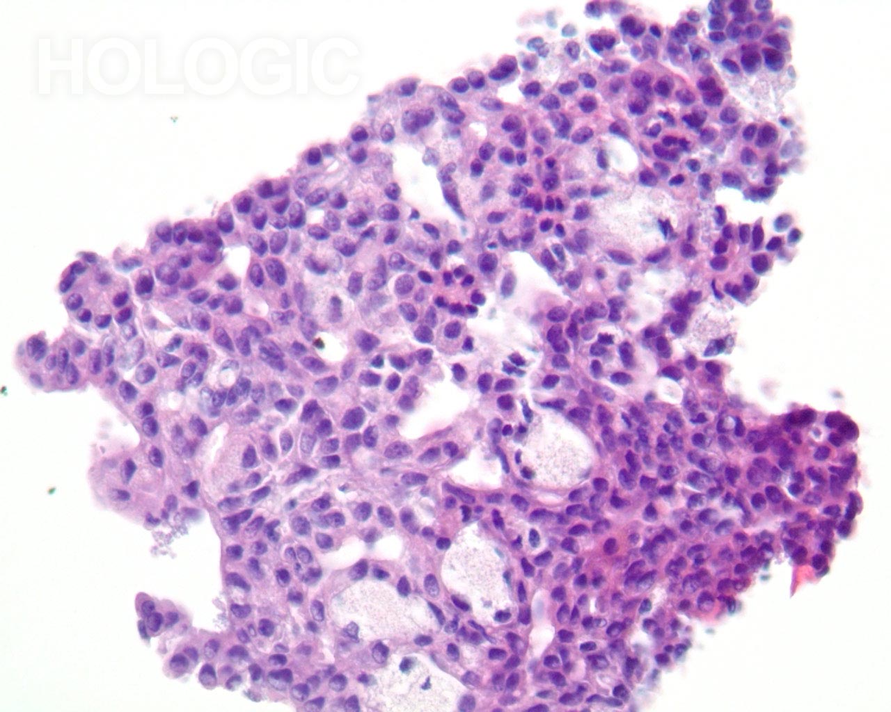 Het is belangrijk op te merken dat atypische kernen niet kernmerkend zijn voor een laaggradig ductaal carcinoom in situ of atypische hyperplasie. Atypische kernen zijn een kenmerk van hooggradige ductale carcinomen. In celblokken worden de kenmerken van de kern duidelijk bewaard, vergelijkbaar met cytologische preparaten, waardoor zowel de laaggradige veranderingen in de architectuur als de hooggradige veranderingen in de cytologie kunnen worden opgemerkt.