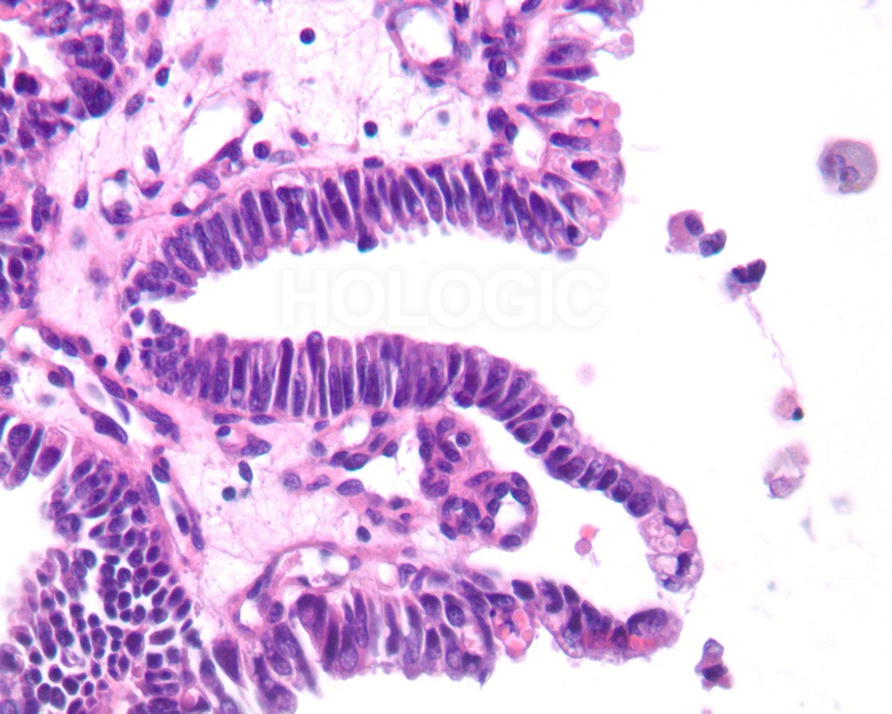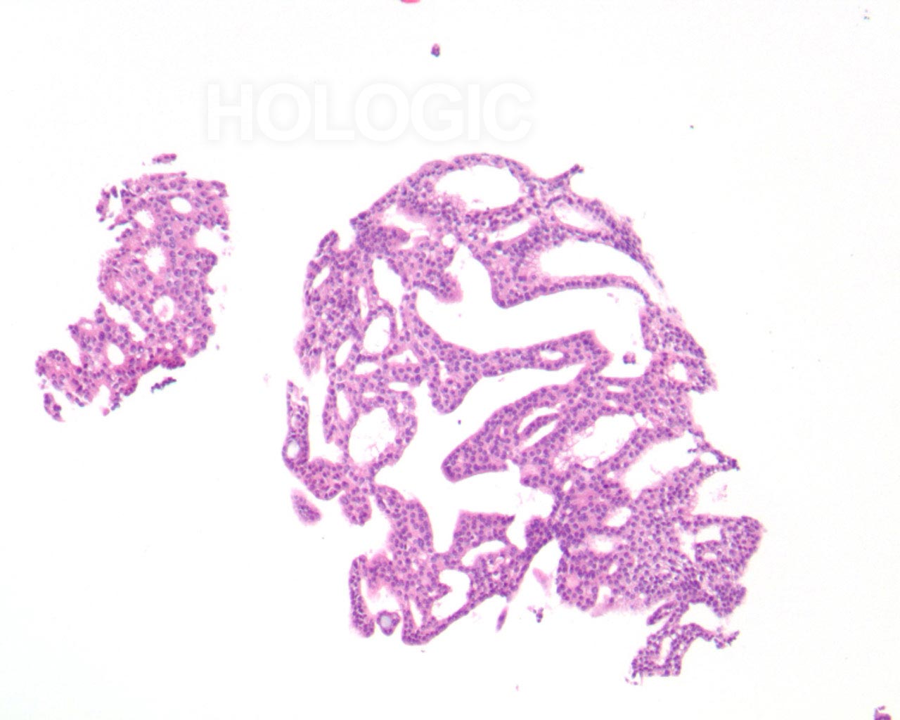 Stratificatie van de ductale cellen staat bekend als hyperplasie of proliferatieve veranderingen. Storend bloed en de dikte van de fragmenten maken het moeilijk om in te schatten hoe veel hyperplasie aanwezig is.