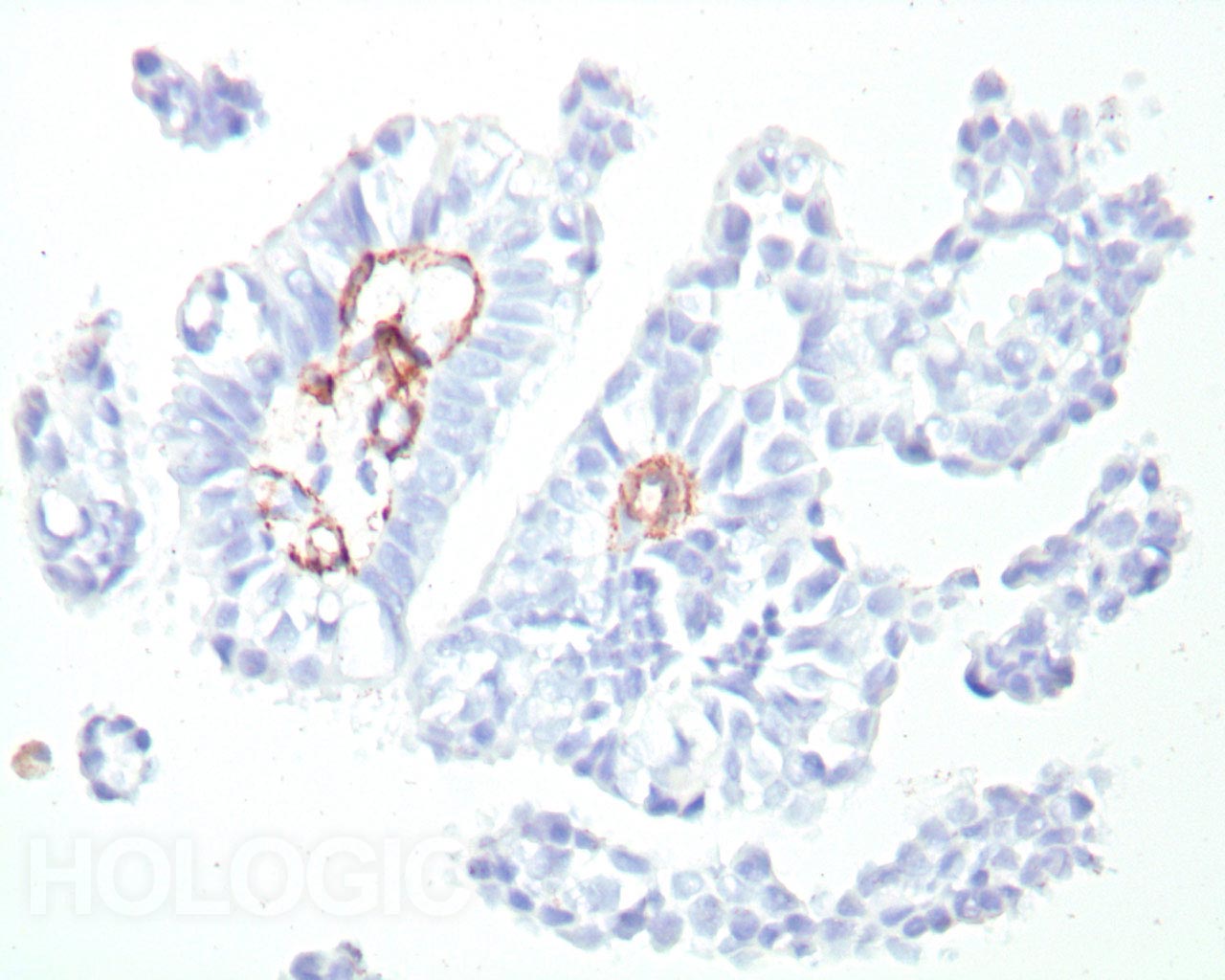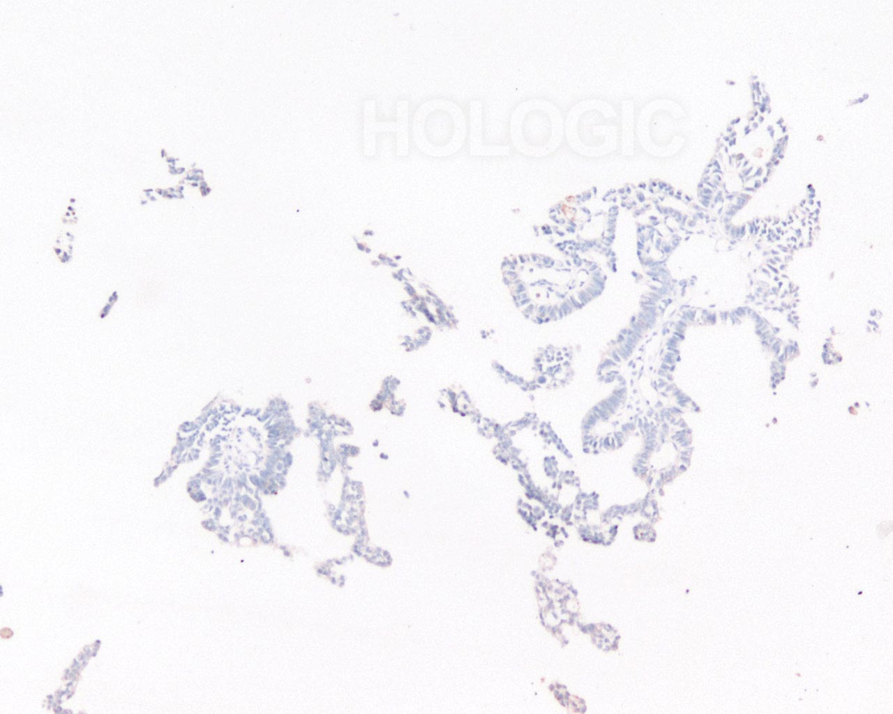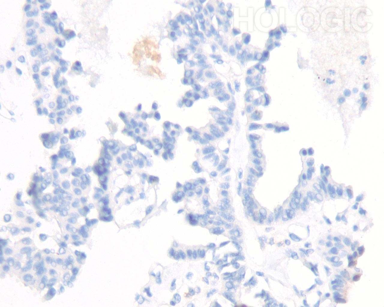 Een immunokleuring met p63 voor myoepitheliale cellen is ook negatief bij de patiënt die in voorgaande afbeeldingen getoond is; dit steunt de diagnose van papillair carcinoom.