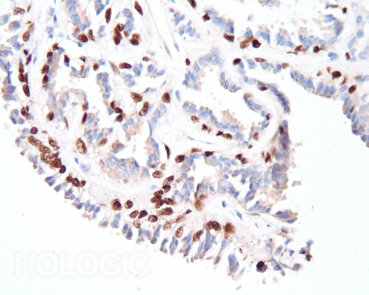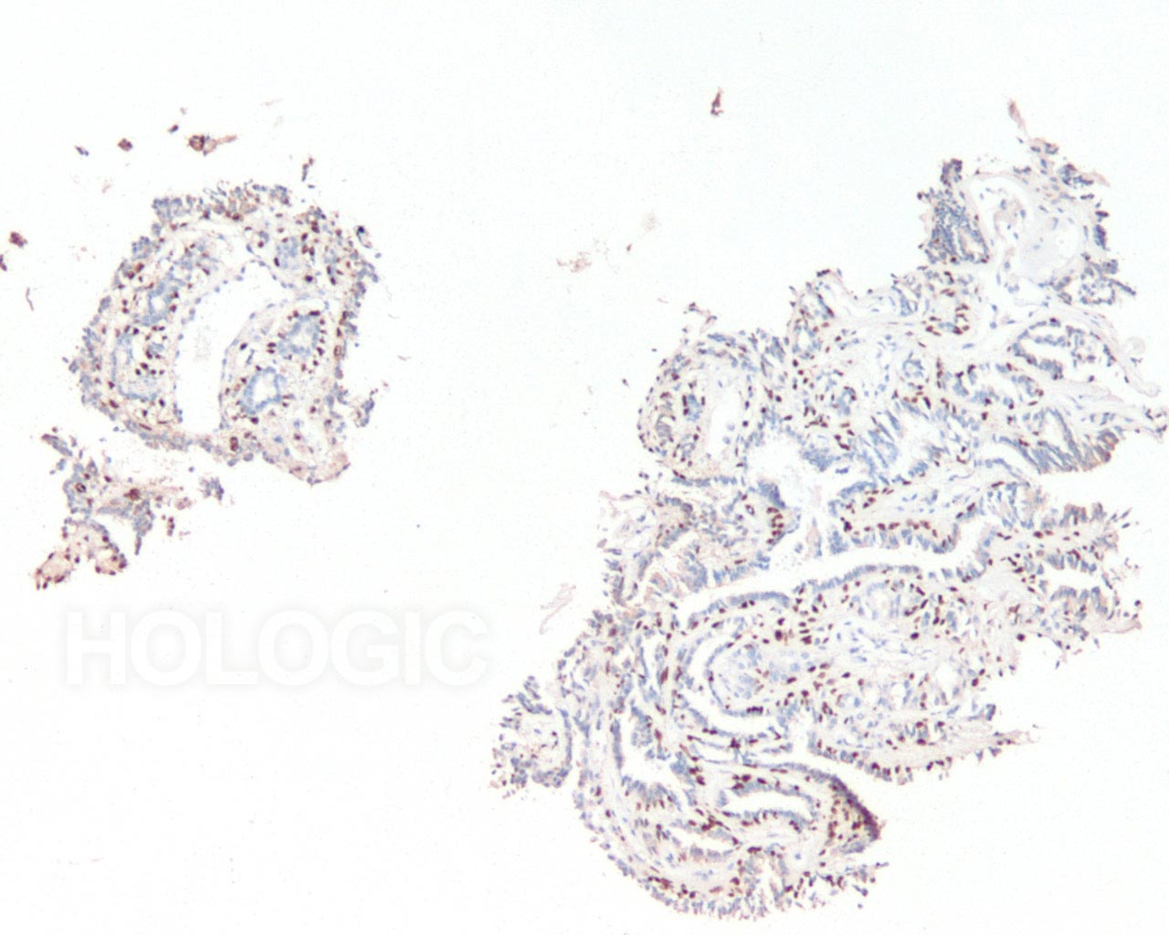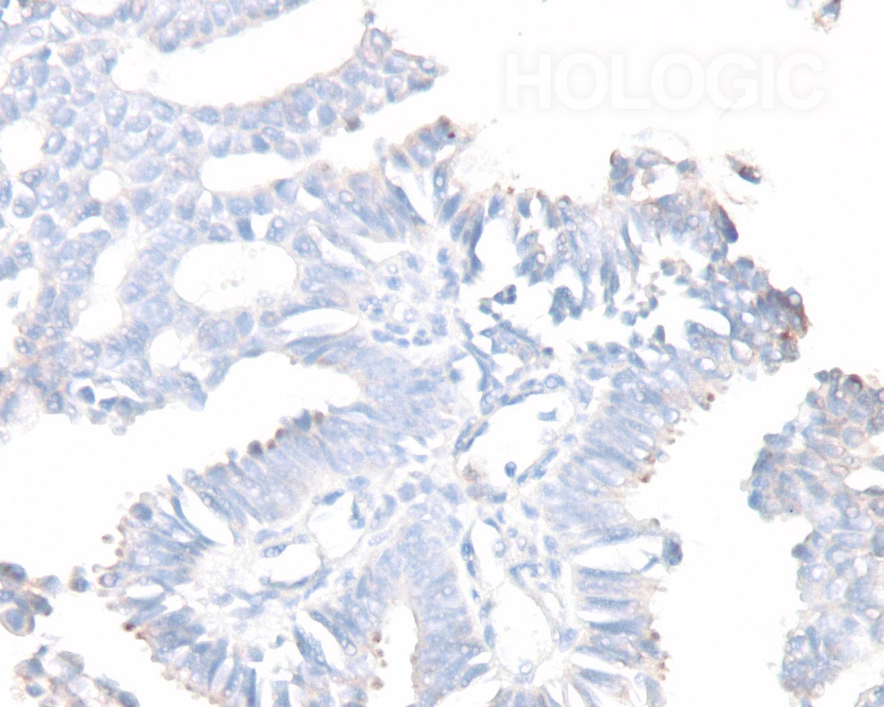Een immunokleuring met p63 voor myoepitheliale cellen is ook negatief bij de patiënt die in voorgaande afbeeldingen getoond is; dit steunt de diagnose van papillair carcinoom.