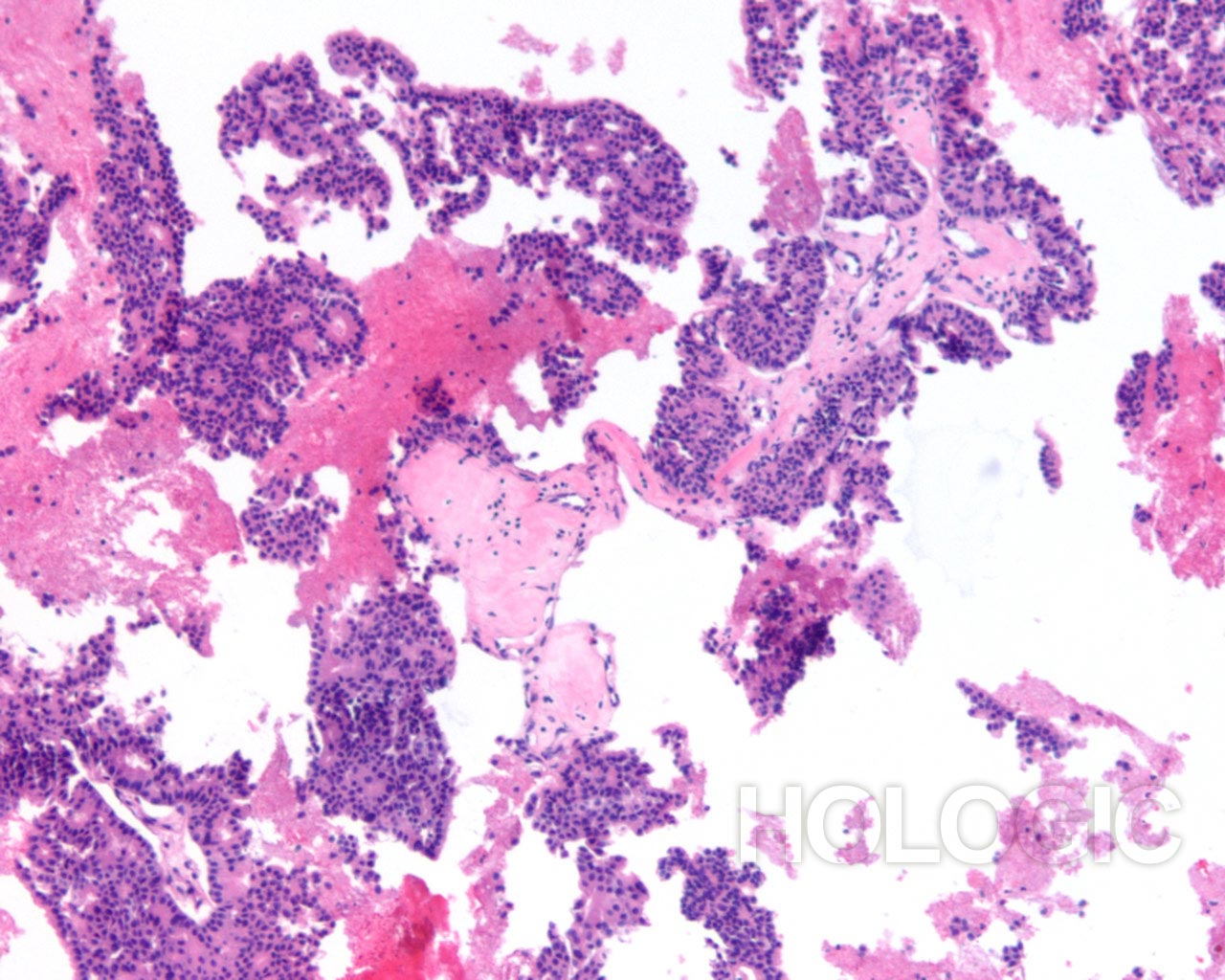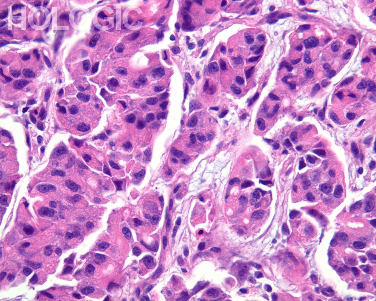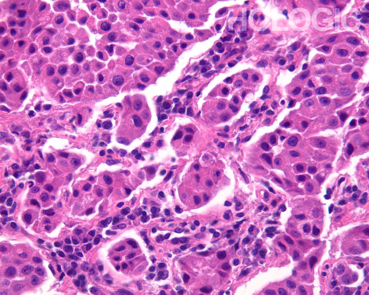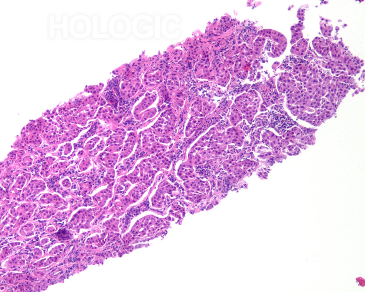 Een overeenkomstige weefselcoupe toont de micropapillaire (solide) en holle glandulaire groepen, met afzonderlijke cellen in de achtergrond.