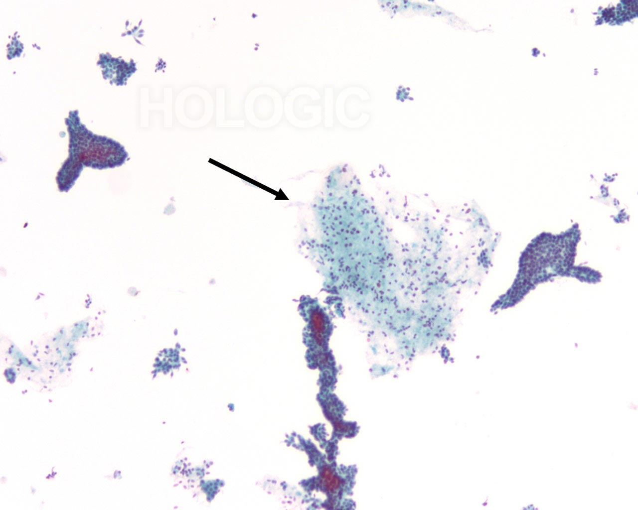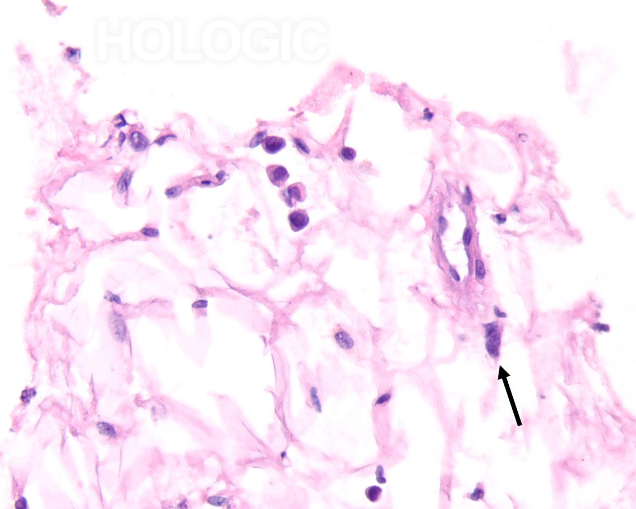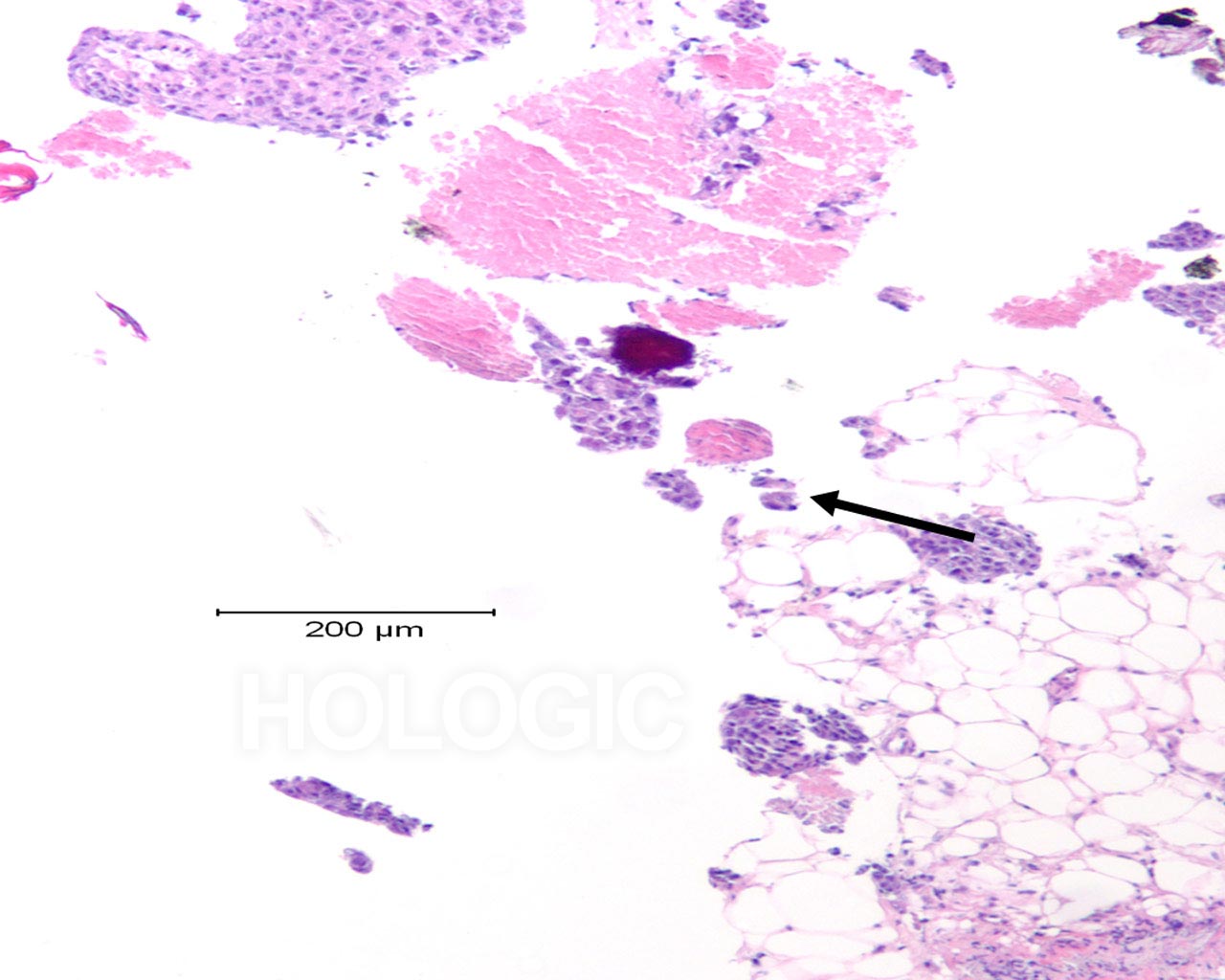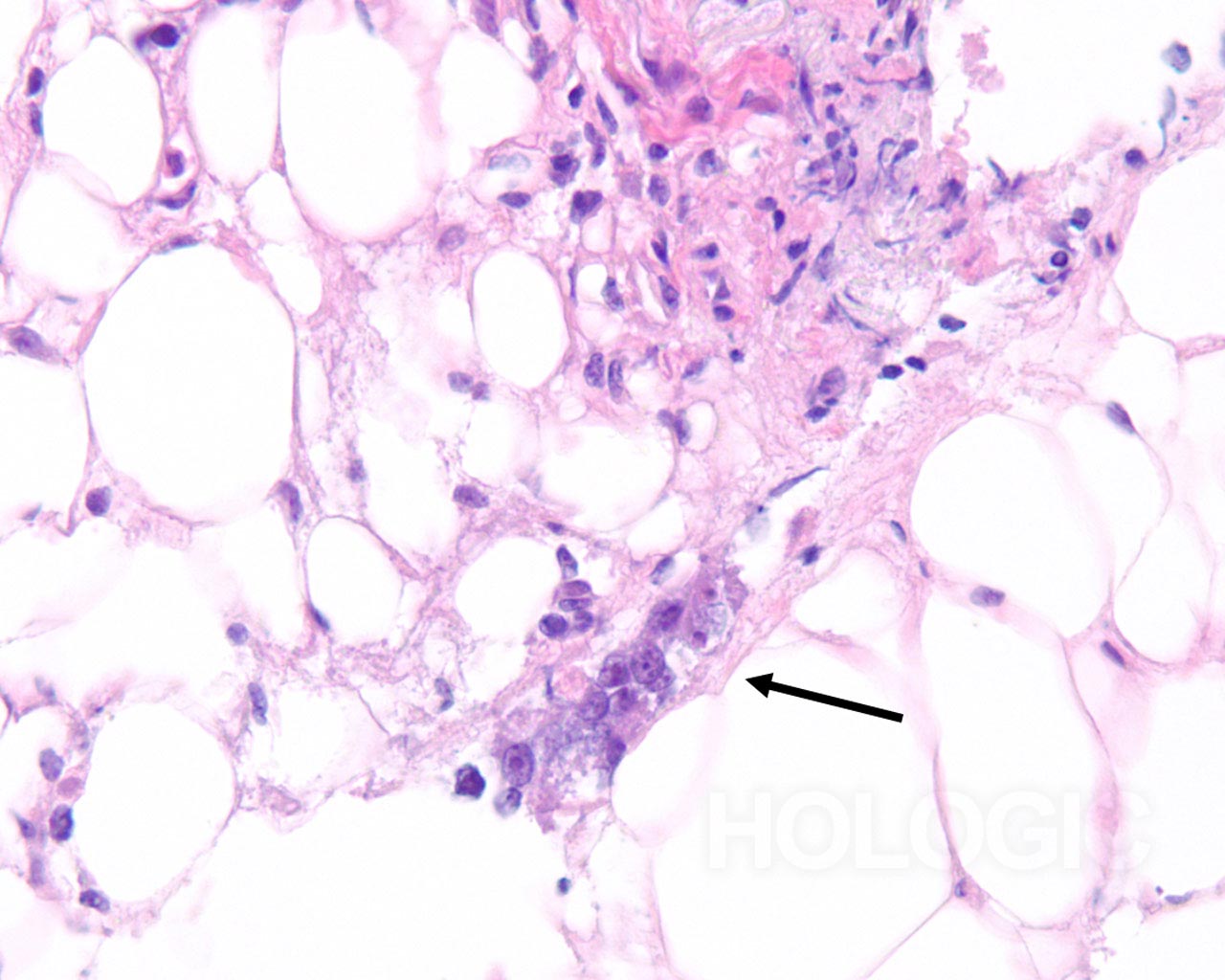 In dit veld worden enkele losgekomen lobulaire carcinoomcellen weergegeven die vermengd zijn met het vetweefsel. Twee andere cellen zijn verdacht voor invasiviteit in het weefsel (pijl).