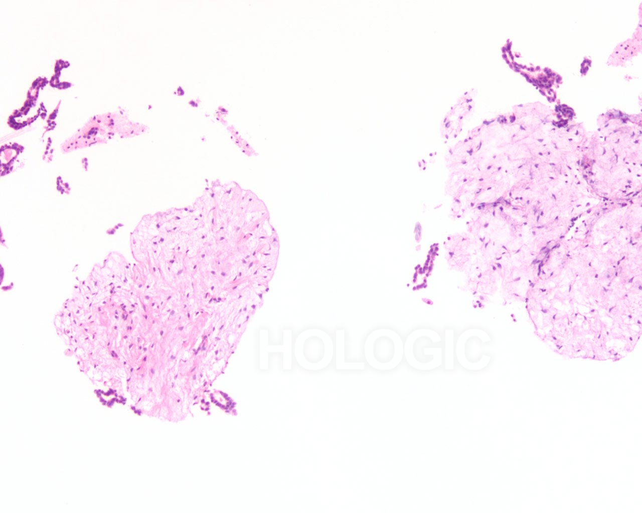 Kenmerkende fibromyxoïde stroma is aanwezig met benigne ductale cellen.