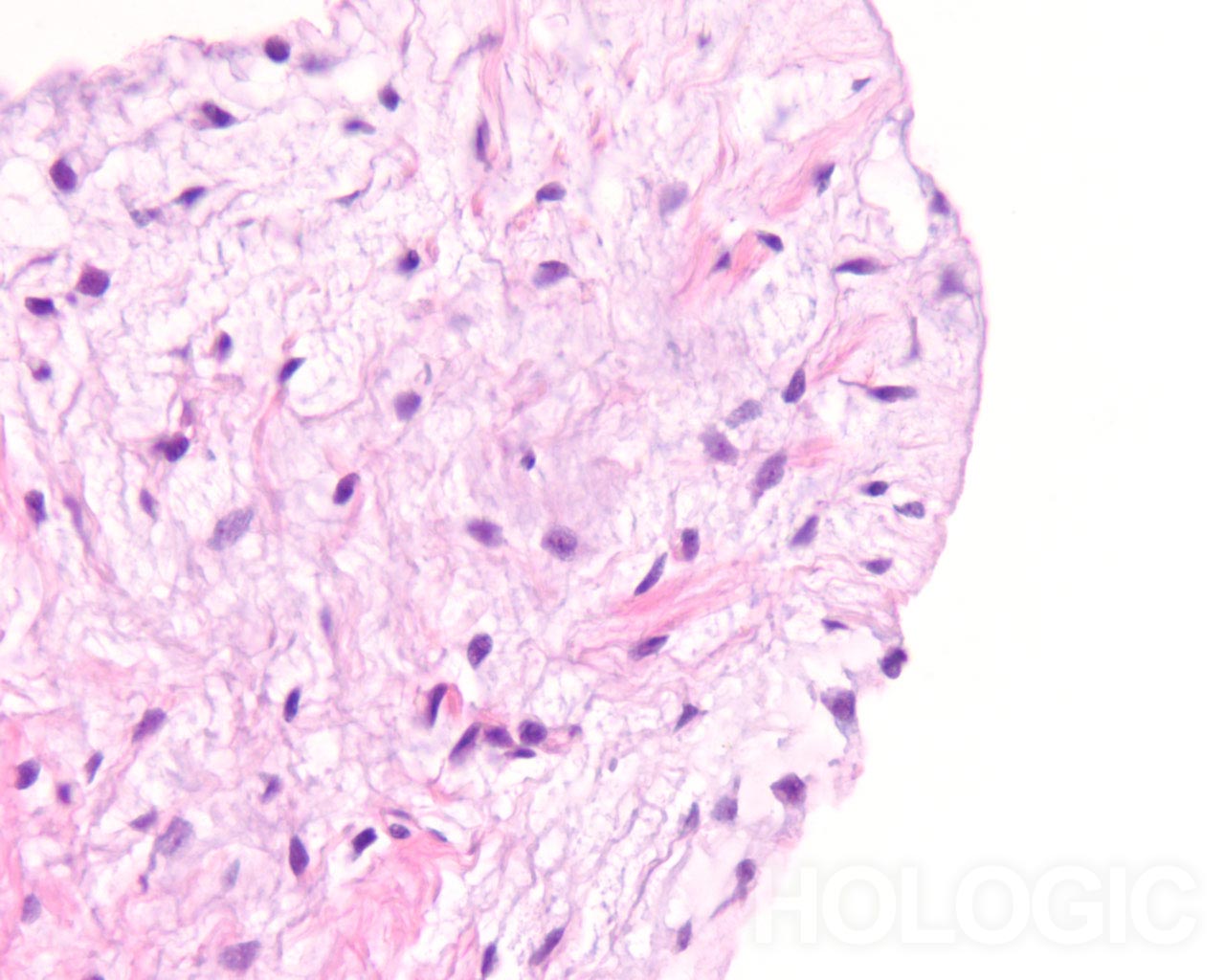 Let op het gladde oppervlak van dit naakte fibromxyoïde stromale fragment en de eentonige morfologie van de mesenchymale kernen.