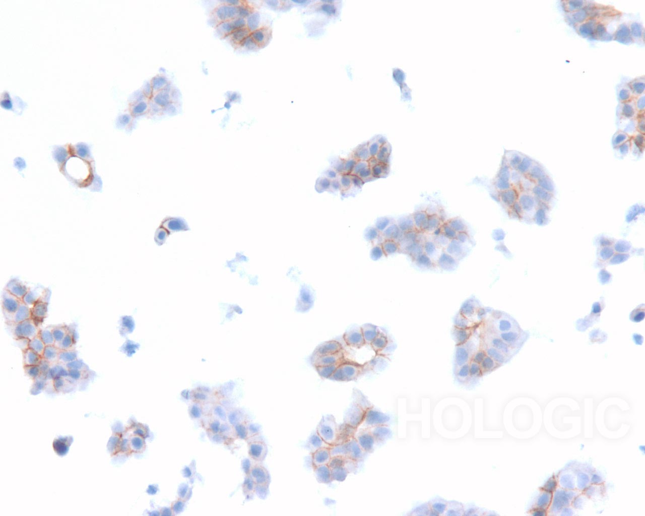 Dako HercepTest 3+ kleuring voor Her2/Neu wordt waargenomen in de invasieve tumor. Voor sommige toepassingen kan het nodig zijn om positiviteit voor Her2/neu van de invasieve tumor te onderscheiden van die van een in situ component.