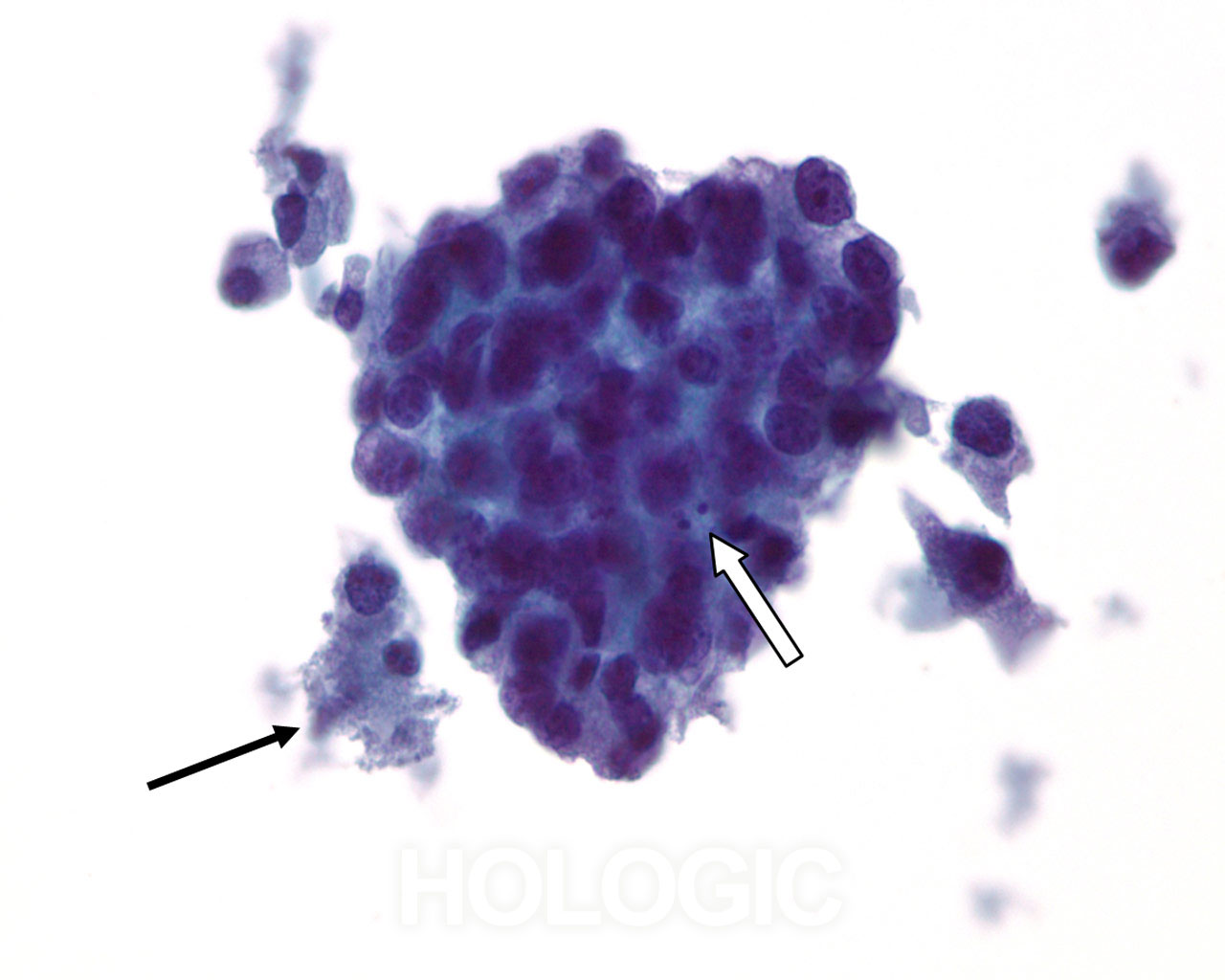 Als de papillen dun zijn, kunnen fibrovasculaire kernen worden geïdentificeerd in cytologische preparaten. Als de overliggende ductale cellen niet te gestratificeerd zijn, kunnen myoepitheliale cellen mogelijk onder de ductale cellen worden geïdentificeerd (open pijlen), hetgeen pleit voor de diagnose van een papilloom in plaats van een papillair carcinoom.