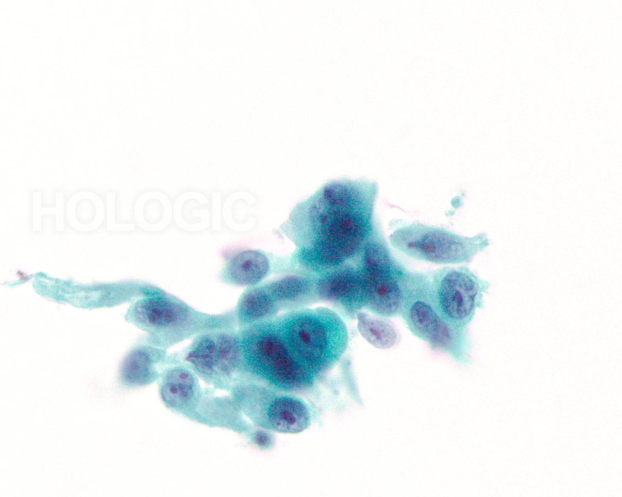 Bij een sterkere vergroting kan men door van boven naar beneden te focussen enkele vermoedelijke myoepitheliale cellen zien die vermengd zijn met de ductale cellen en vermoedelijke spleetachtige ruimten. Deze twee kenmerken zijn kenmerkend voor ductale hyperplasie van het gewone type, een laesie die ruwweg een tweevoudige toename in het relatieve risico van borstkanker vertegenwoordigt.[14].