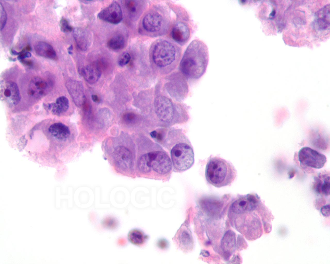 Apoptotische fragmenten, necrotisch materiaal, discohesie, vrije stratificatie en hooggradige nucleaire atypie kunnen duidelijk worden waargenomen.