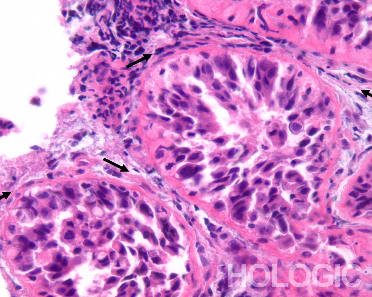 Vergeleken met de onregelmatige, infiltratieve groepen zijn in deze afbeelding de vier profielen van maligne ductale cellen alle omgeven door een glad, dicht, helderroze collageen basaalmembraan. Merk op hoe de fibroblasten net buiten het basaalmembraan zijn georganiseerd met hun lange as parallel aan het basaalmembraan (pijlen). Net als bij kernbiopten van de borst sluit de afwezigheid van invasiviteit in dit ene plaatje geen invasiviteit uit in andere gebieden.