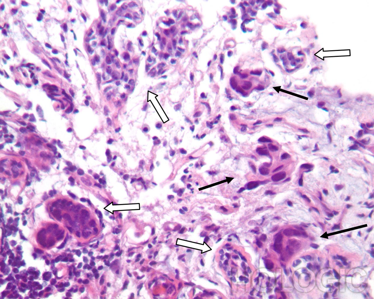 Eén residuele, vermoedelijk niet-invasieve melkgang kan worden waargenomen uiterst rechtsboven in de afbeelding (open pijl). Invasiviteit kan worden gediagnosticeerd in de andere onregelmatige, solide, dunne clusters met maligne ductale cellen die het geactiveerde stromaweefsel willekeurig doorsnijden (pijlen).