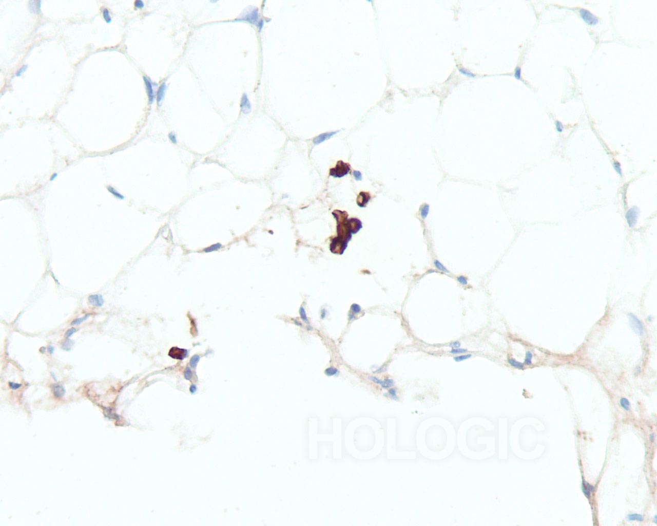 Een cluster van 4 lobulaire carcinoomcellen en enkele andere afzonderlijke lobulaire carcinoomcellen zijn gemarkeerd met een pankeratine immunokleuring.