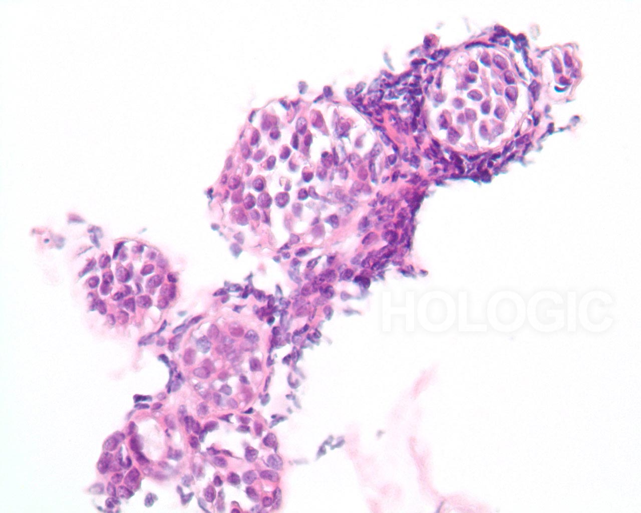 Een enkele rij minimaal atypische spaarzame cellen die op en in de stromale fragmenten vastzitten, kan worden waargenomen. Let op de kenmerkende targetoïde intracytoplasmische vacuolen van lobulaire neoplasie.