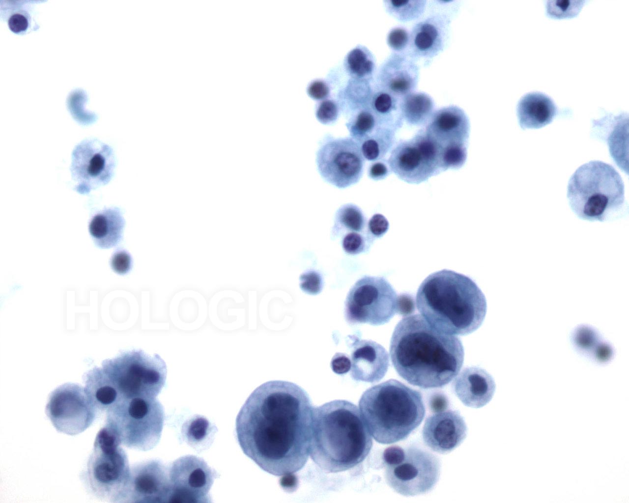 Cells of papillary serous ovarian adenocarcinoma in a pleural effusion represent a discontinuous population of cells. Their cell and nuclear size is variable. Increased nuclear to cytoplasmic ratio and cytoplasmic vacuoles are features. Cells may exist singly or in small acinar groups.