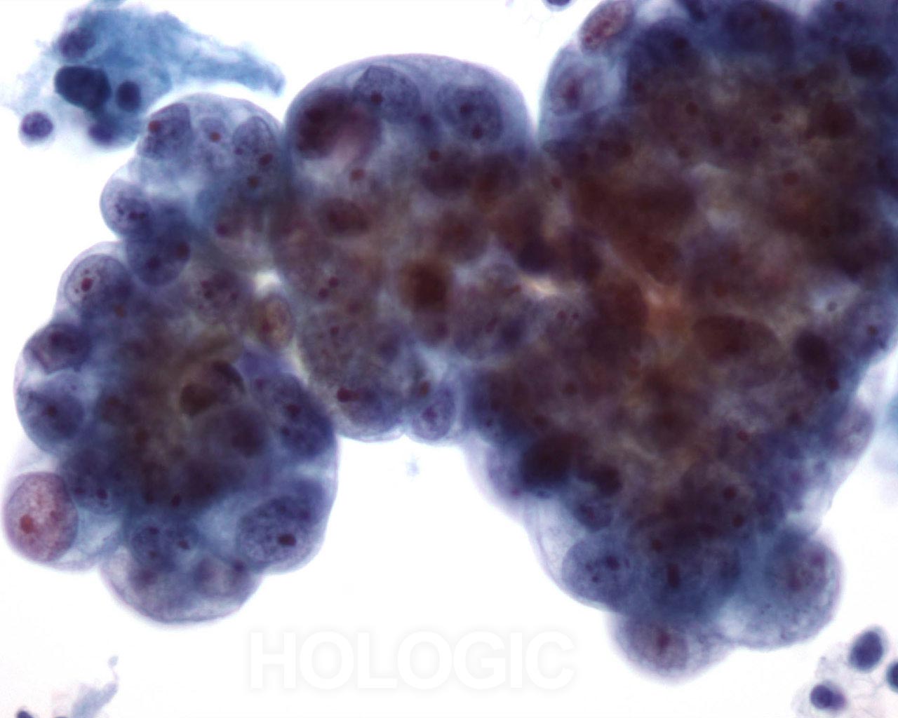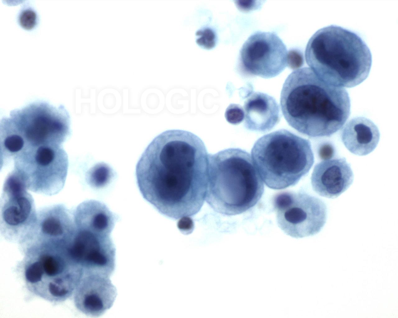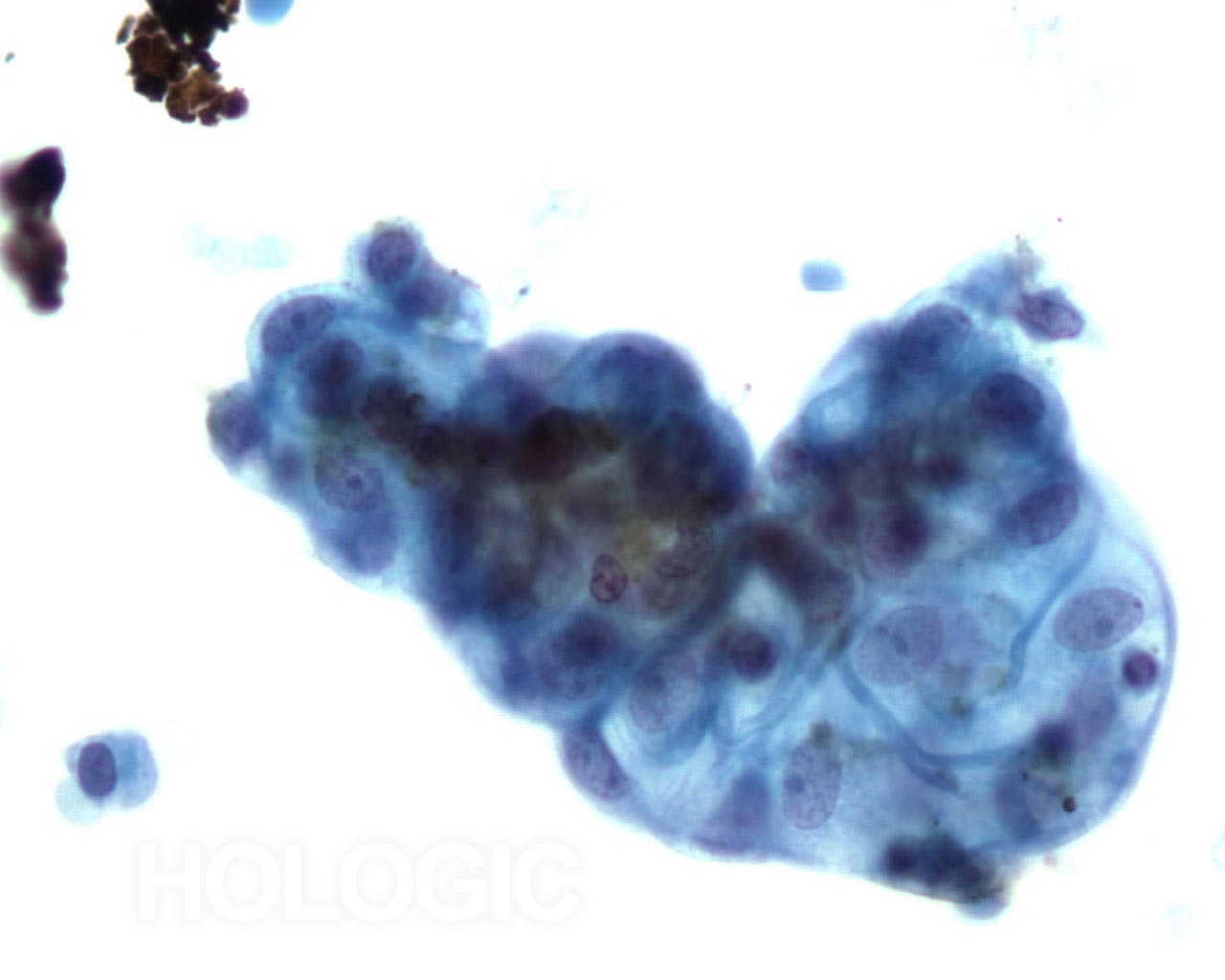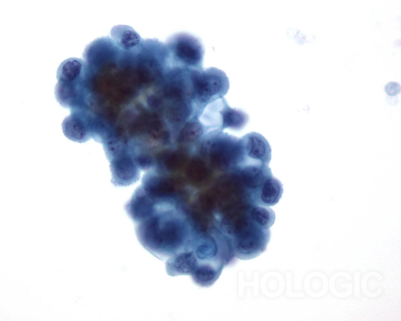 Ovarian adenocarcinoma. A malignant three-dimensional cell group contrasts with a group of four benign cells at upper left.