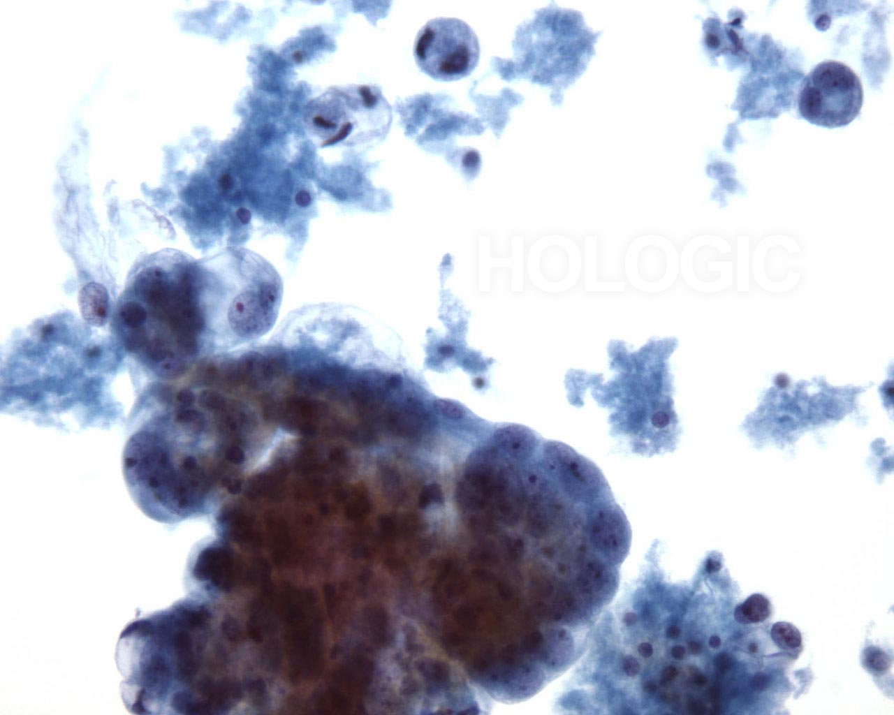 Peritoneal effusion: Ovarian adenocarcinoma. A three-dimensional tumor cell group is seen along with a “dirty” background. 20X