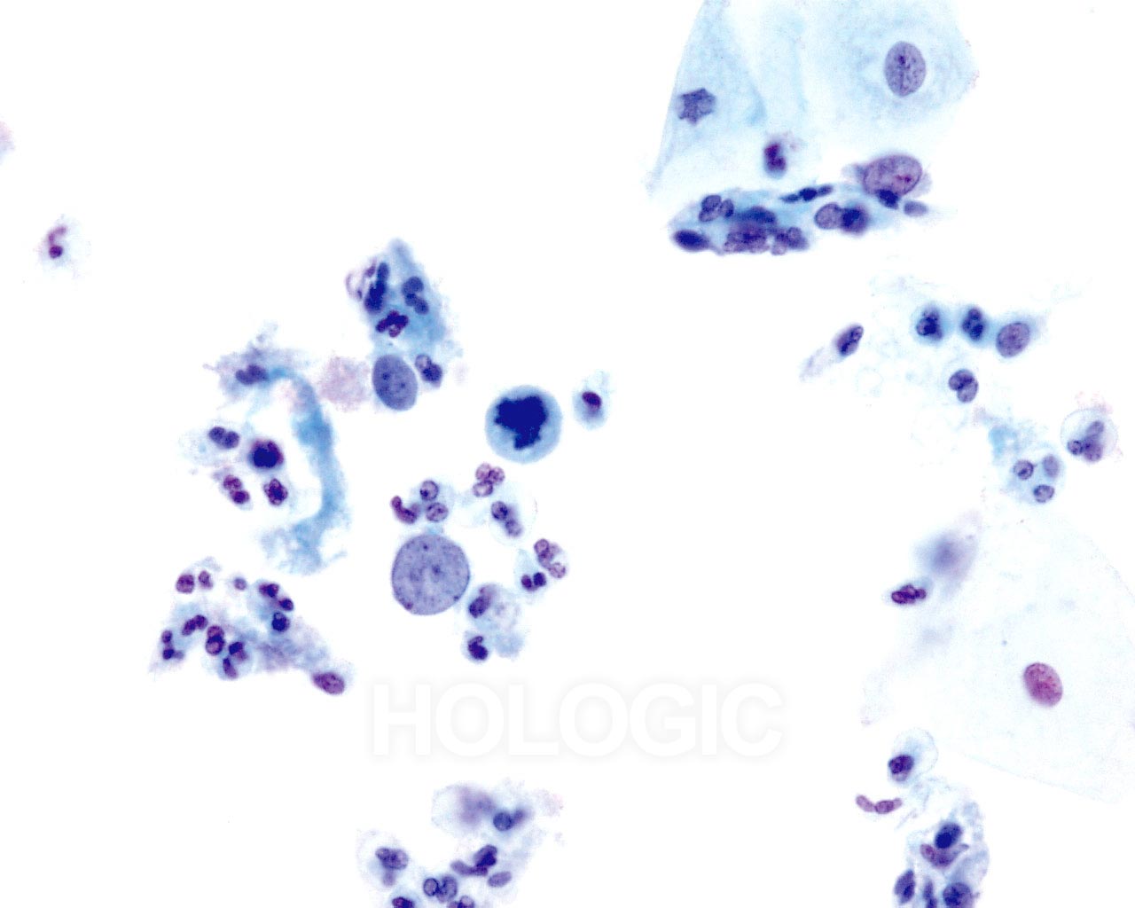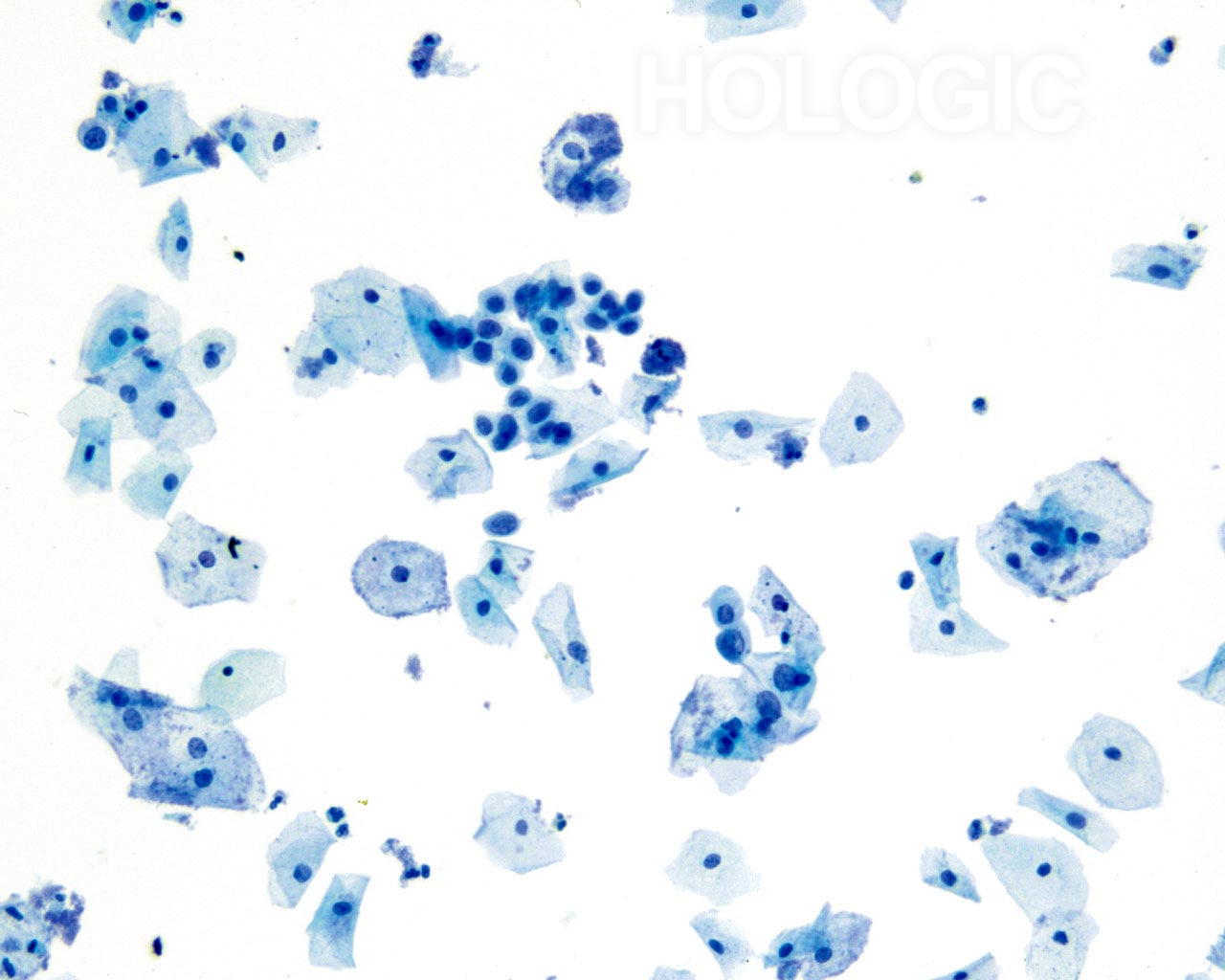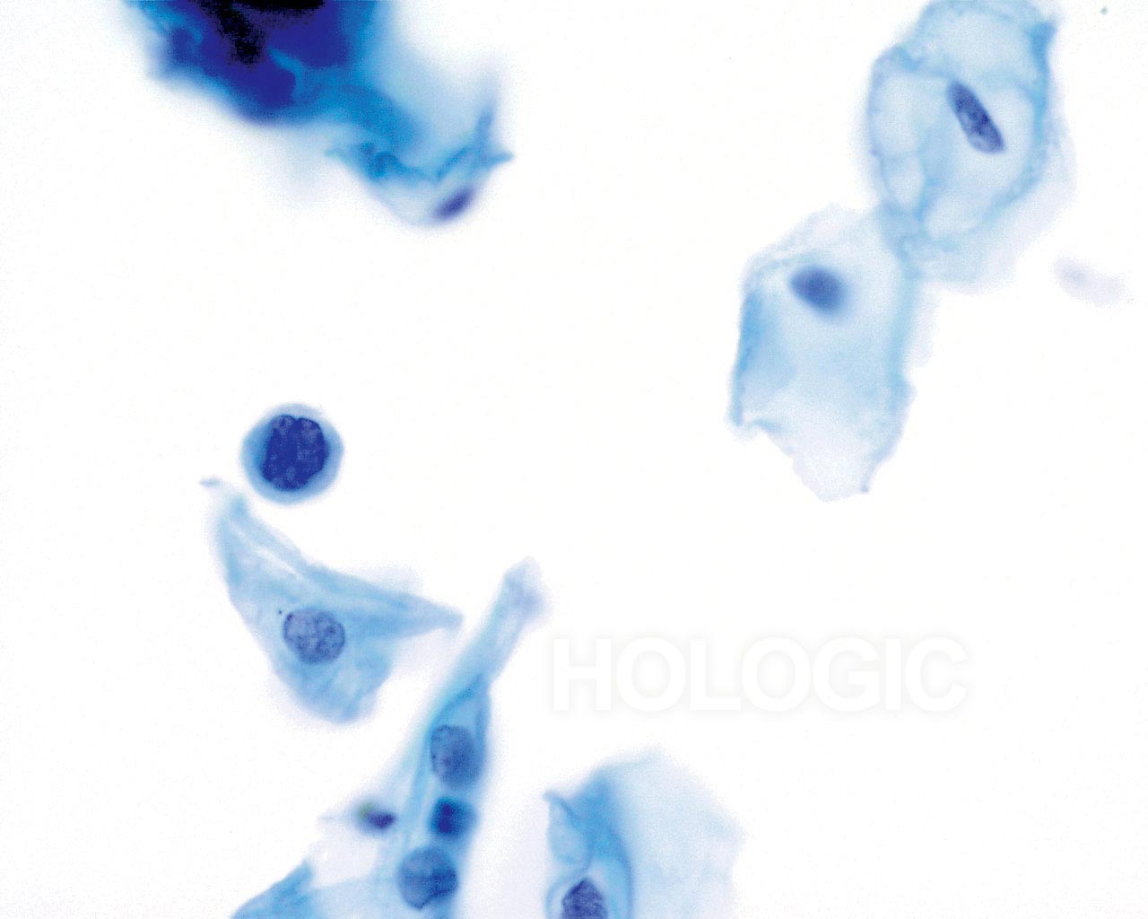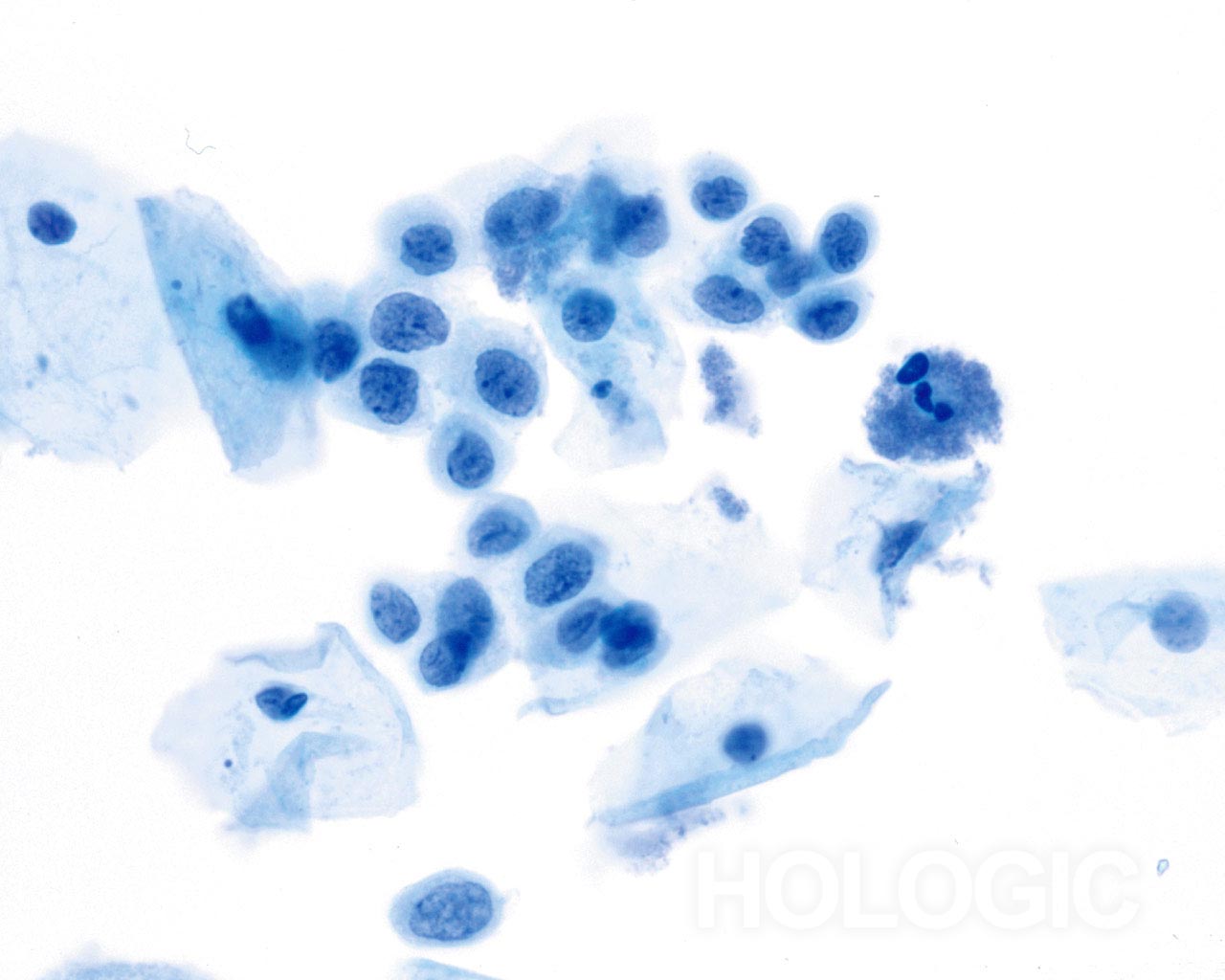 在传统的巴氏涂片上,细小的异常细胞通常会与 HSIL 相伴出现;这些细胞通常会被包裹在粘液中,或“隐藏”在背景物质内的细胞团内。由于在采用 ThinPrep 系统时,粘液和细胞碎片会经过分散处理,因此由该系统处理的标本会看起来有所不同。在使用倍镜读片时,细小的 HSIL 细胞会以单个细胞或以小细胞团的形式,在细胞的沉积背景中“凸显”出来。这些细胞应能提醒您:应更加密切地关注所呈现出的细胞物质,并查找是否有更多可供诊断的高度上皮细胞团。只要在低倍镜下看到这些细小的单个细胞或细胞团,就可在高倍镜下对这一部分玻片进行“筛查”。ThinPrep 系统的分散处理流程不会使真正的上皮细胞团发生破碎(因为高度病变存在异型性),并将会呈现出更多的单个细胞,注意到这点是至关重要的;这些是寻找病变细胞的“线索”。