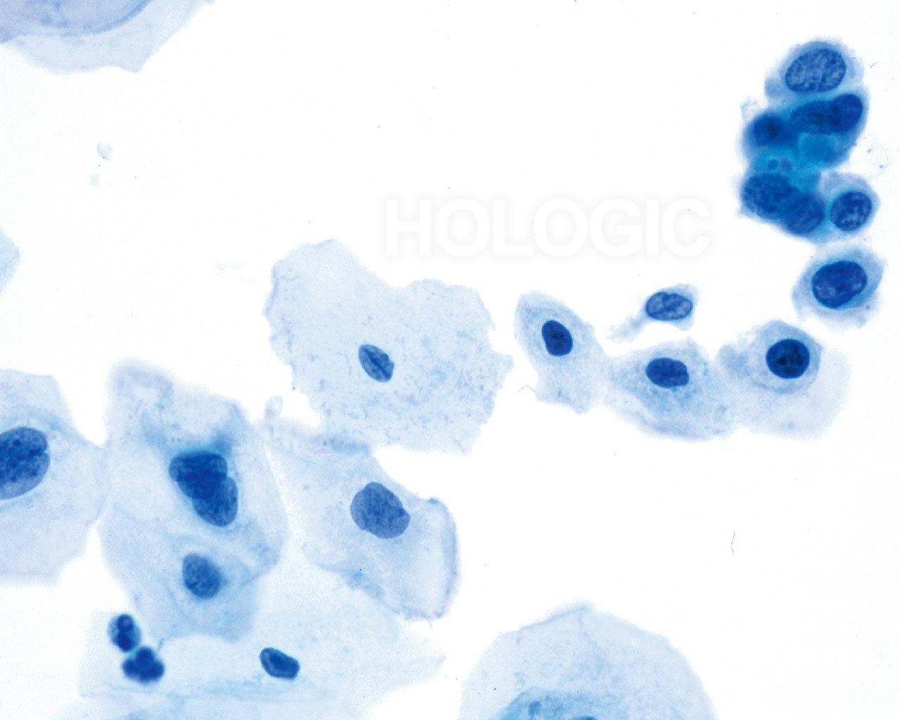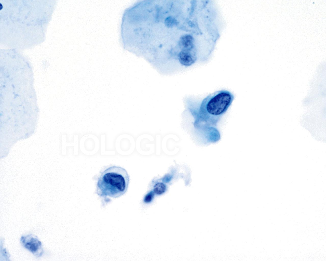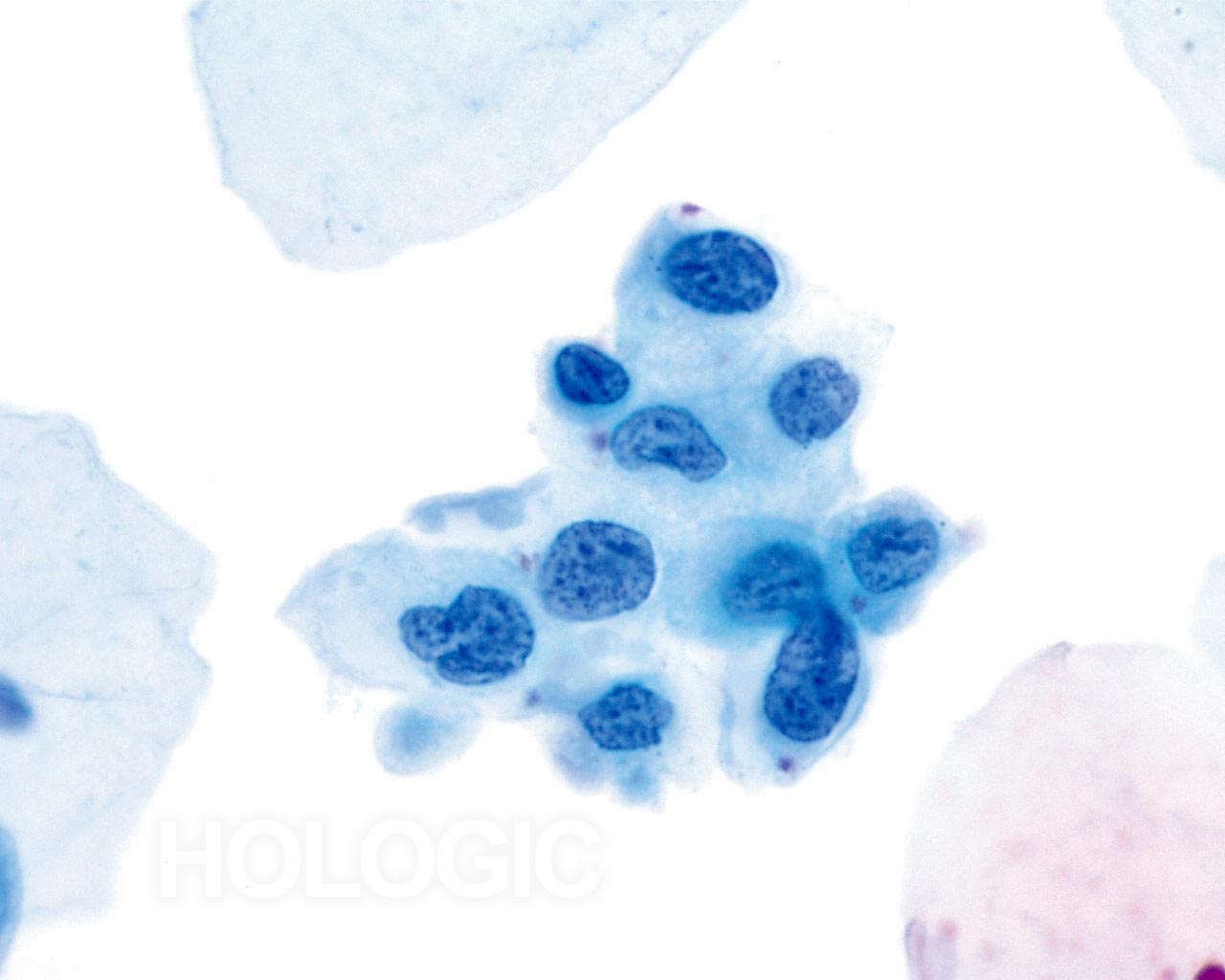 这些三维细胞结构的异型性可与简单的“不规则细胞核轮廓”区别开来;在 ThinPrep® 玻片上,这些将是良性细胞的一种特征表现。由于是二维的, 由于是二维的,当检查员在显微镜下上下对焦时,这些“褶皱”像裂缝或山脉般难以在胞核中心被追踪,这样会为无经验者做成相类似的假像。